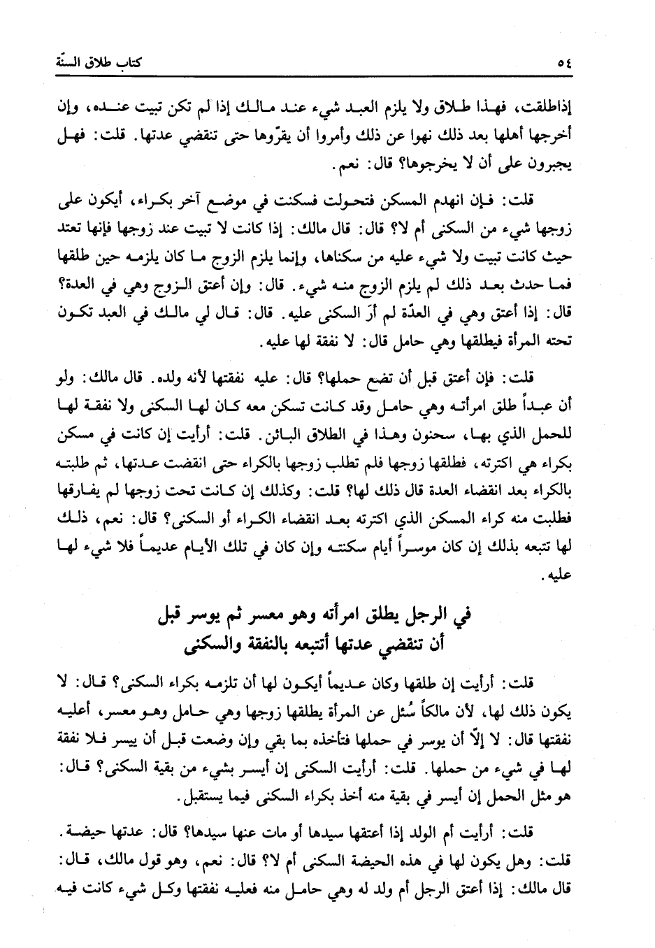 فِي الرَّجُلِ يُطَلِّقُ امْرَأَتَهُ وَهُوَ مُعْسِرٌ ثُمَّ يُوسِرُ قَبْلَ أَنْ تَنْقَضِيَ عِدَّتُهَا أَتَتْبَعُهُ بِالنَّفَقَةِ وَالسُّكْنَى قُلْتُ: أَرَأَيْتَ إنْ طَلَّقَهَا وَكَانَ عَدِيمًا أَيَكُونُ لَهَا أَنْ تَلْزَمَهُ بِكِرَاءِ السُّكْنَى؟