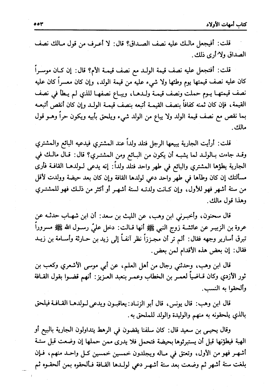 قَالَ سَحْنُونٌ، وَأَخْبَرَنِي ابْنُ وَهْبٍ، عَنْ اللَّيْثِ بْنِ سَعْدٍ: أَنَّ ابْنَ شِهَابٍ حَدَّثَهُ عَنْ عُرْوَةَ بْنِ الزُّبَيْرِ عَنْ عَائِشَةَ زَوْجِ النَّبِيِّ - صَلَّى اللَّهُ عَلَيْهِ وَسَلَّمَ - أَنَّهَا قَالَتْ: «دَخَلَ عَلَيَّ رَسُولُ اللَّهِ - صَلَّى اللَّهُ عَلَيْهِ وَسَلَّمَ - مَسْرُورًا تَبْرُقُ أَسَارِيرُ وَجْهِهِ فَقَالَ: أَلَمْ تَرَ أَنَّ مُجَزِّزًا نَظَرَ آنِفًا إلَى زَيْدِ بْنِ حَارِثَةَ وَأُسَامَةَ بْنِ زَيْدٍ فَقَالَ: إنَّ بَعْضَ هَذِهِ الْأَقْدَامِ لَمِنْ بَعْضٍ» .