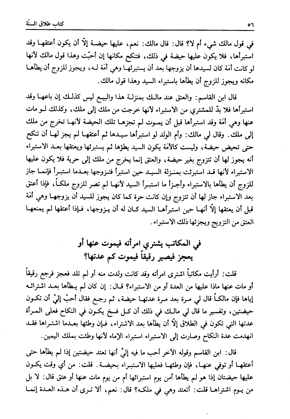 فِي قَوْلِ مَالِكٍ شَيْءٌ أَمْ لَا؟ قَالَ: قَالَ مَالِكٌ: نَعَمْ، عَلَيْهَا حَيْضَةٌ إلَّا أَنْ يَكُونَ أَعْتَقَهَا وَقَدْ اسْتَبْرَأَهَا، فَلَا يَكُونُ عَلَيْهَا حَيْضَةٌ فِي ذَلِكَ، فَتُنْكَحُ مَكَانَهَا إنْ أَحَبَّتْ وَهَذَا قَوْلُ مَالِكٍ؛ لِأَنَّهَا لَوْ كَانَتْ أَمَةً كَانَ لِسَيِّدِهَا أَنْ يُزَوِّجَهَا بَعْدَ أَنْ يَسْتَبْرِئَهَا وَهِيَ أَمَةٌ لَهُ، وَيَجُوزُ لِلزَّوْجِ أَنْ يَطَأَهَا مَكَانَهُ وَيَجُوزُ لِلزَّوْجِ أَنْ يَطَأَهَا بِاسْتِبْرَاءِ السَّيِّدِ وَهَذَا قَوْلُ مَالِكٍ