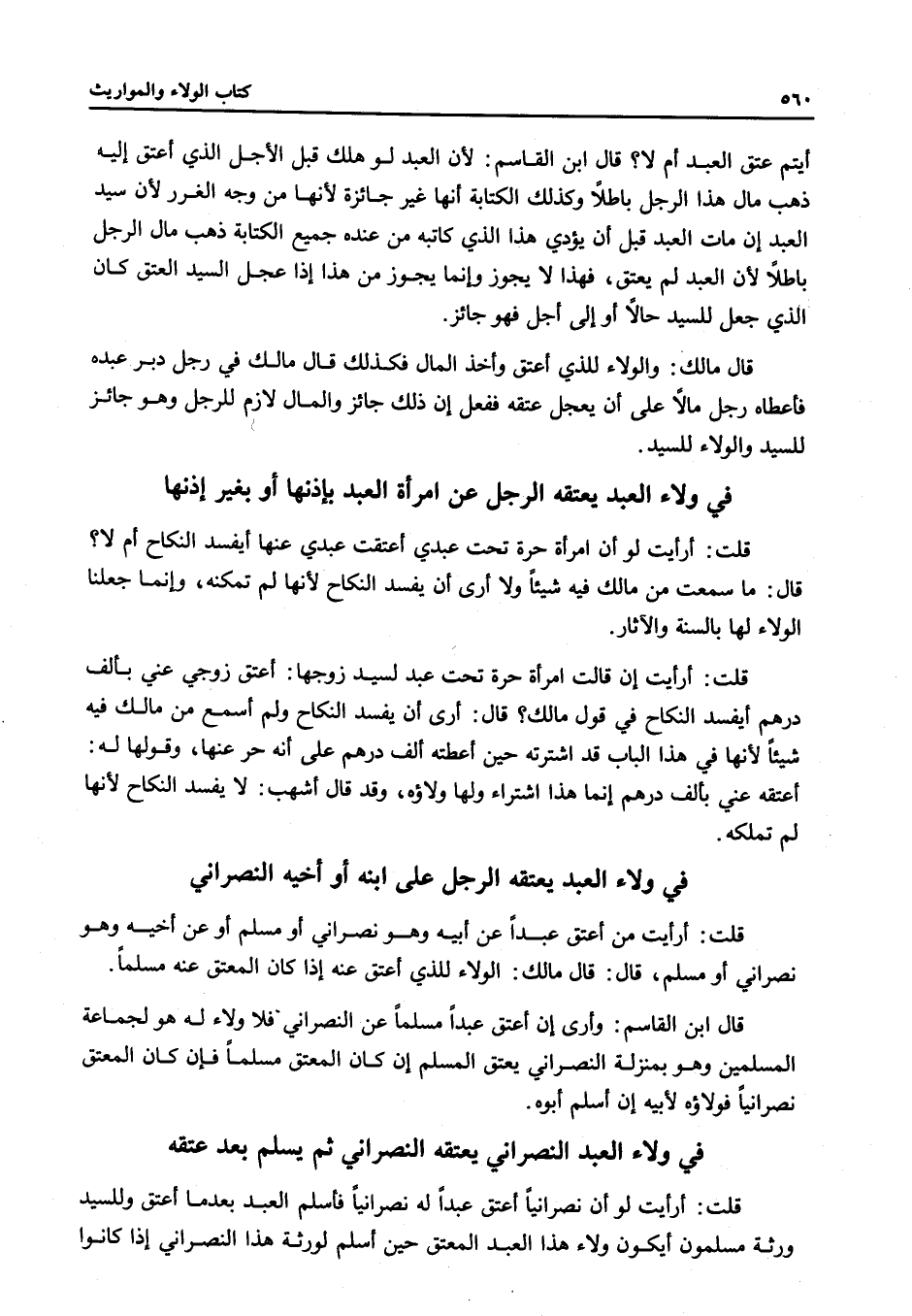 فِي وَلَاءِ الْعَبْدِ النَّصْرَانِيِّ يُعْتِقُهُ النَّصْرَانِيُّ ثُمَّ يُسْلِمُ بَعْدَ عِتْقِهِ قُلْتُ: أَرَأَيْتَ لَوْ أَنَّ نَصْرَانِيًّا أَعْتَقَ عَبْدًا لَهُ نَصْرَانِيًّا فَأَسْلَمَ الْعَبْدُ بَعْدَمَا أُعْتِقَ وَلِلسَّيِّدِ وَرَثَةٌ مُسْلِمُونَ أَيَكُونُ وَلَاءُ هَذَا الْعَبْدِ الْمُعْتَقِ حِينَ أَسْلَمَ لِوَرَثَةِ هَذَا النَّصْرَانِيِّ إذَا كَانُوا