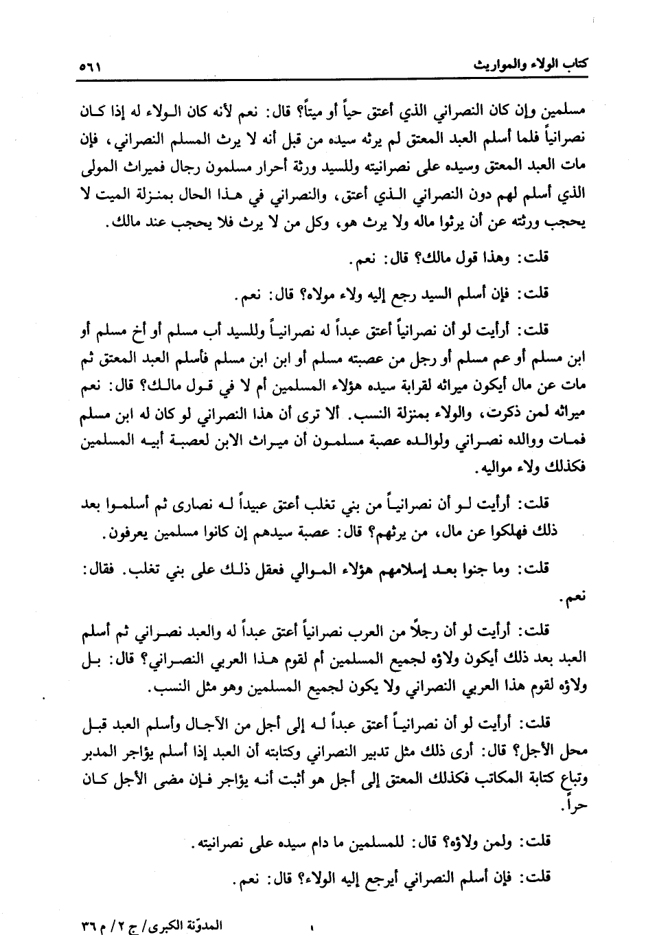 قُلْتُ: أَرَأَيْتَ لَوْ أَنَّ نَصْرَانِيًّا مِنْ بَنِي تَغْلِبَ أَعْتَقَ عَبِيدًا لَهُ نَصَارَى ثُمَّ أَسْلَمُوا بَعْدَ ذَلِكَ فَهَلَكُوا عَنْ مَالٍ، مَنْ يَرِثُهُمْ؟