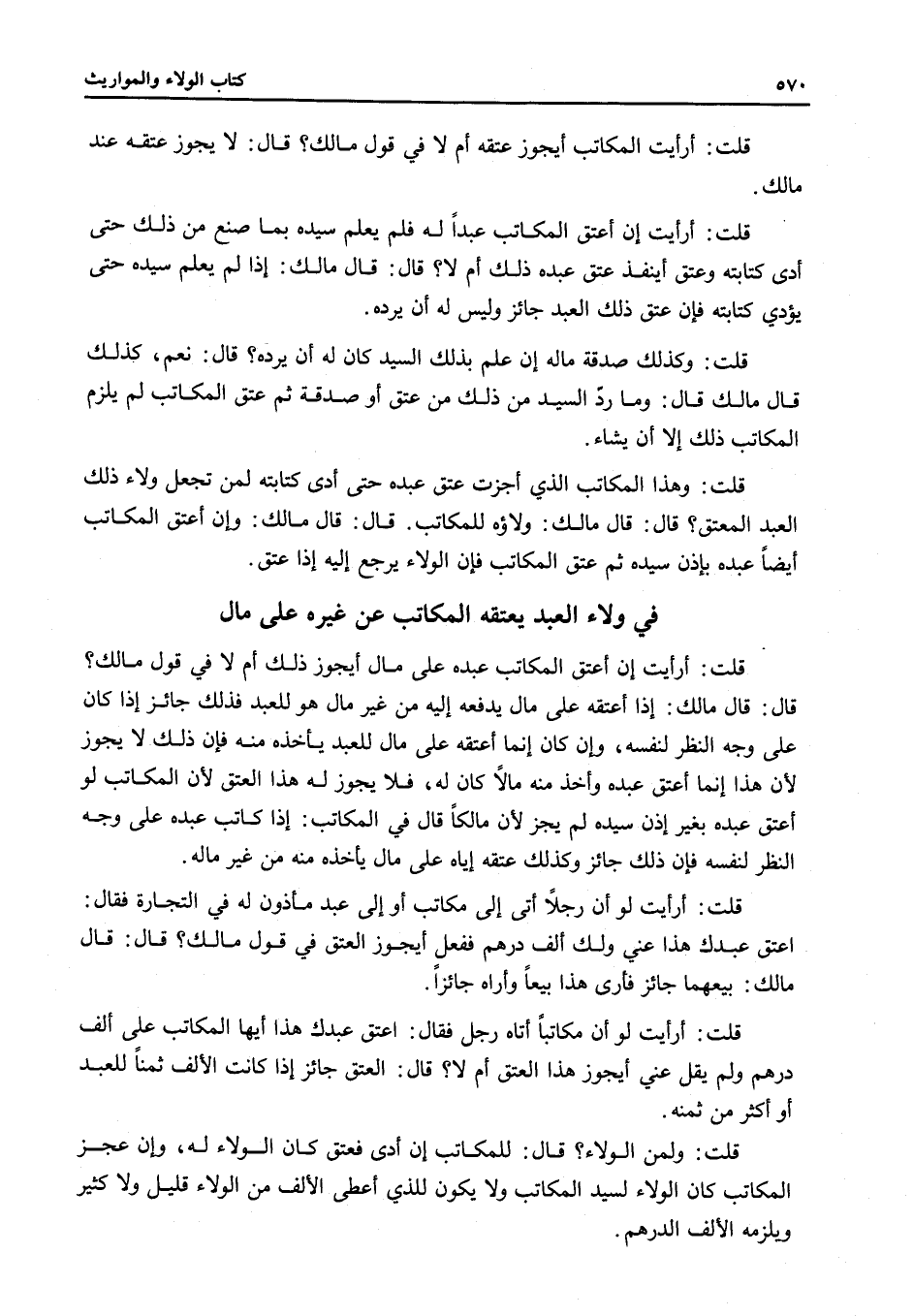 فِي وَلَاءِ الْعَبْدِ يُعْتِقُهُ الْمُكَاتَبُ عَنْ غَيْرِهِ عَلَى مَالٍ قُلْتُ: أَرَأَيْتَ إنْ أَعْتَقَ الْمُكَاتَبُ عَبْدَهُ عَلَى مَالٍ أَيَجُوزُ ذَلِكَ أَمْ لَا فِي قَوْلِ مَالِكٍ؟
