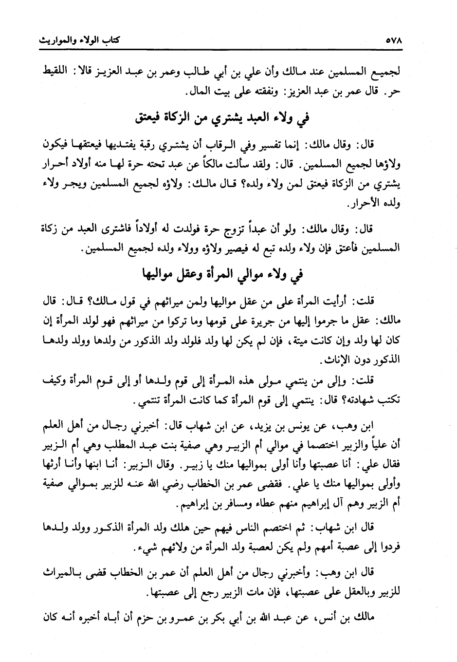 قَالَ ابْنُ وَهْبٍ: وَأَخْبَرَنِي رِجَالٌ مِنْ أَهْلِ الْعِلْمِ أَنَّ عُمَرَ بْنَ الْخَطَّابِ قَضَى بِالْمِيرَاثِ لِلزُّبَيْرِ بِالْعَقْلِ عَلَى عَصَبَتِهَا، فَإِنْ مَاتَ الزُّبَيْرُ رَجَعَ إلَى عَصَبَتِهَا. مَالِكُ بْنُ أَنَسٍ، عَنْ عَبْدِ اللَّهِ بْنِ أَبِي بَكْرِ بْنِ عَمْرِو بْنِ حَزْمٍ أَنَّ أَبَاهُ أَخْبَرَهُ أَنَّهُ كَانَ