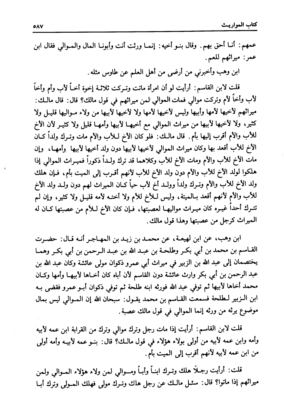 قَالَ مَالِكٌ: فَلَوْ كَانَ الْأَخُ لِلْأَبِ وَالْأُمِّ مَاتَ وَتَرَكَ وَلَدًا كَانَ الْأَخُ لِلْأَبِ أَقْعَدَ بِهَا وَكَانَ مِيرَاثُ الْمَوَالِي لِأَخِيهَا لِأَبِيهَا دُونَ وَلَدِ أَخِيهَا لِأَبِيهَا وَأُمِّهَا، وَإِنْ مَاتَ الْأَخُ لِلْأَبِ وَالْأُمِّ وَمَاتَ الْأَخُ لِلْأَبِ وَكِلَاهُمَا قَدْ تَرَكَ وَلَدًا ذُكُورًا فَمِيرَاثُ الْمَوَالِي إذَا هَلَكُوا لِوَلَدِ الْأَخِ لِلْأَبِ وَالْأُمِّ دُونَ وَلَدِ الْأَخِ لِلْأَبِ لِأَنَّهُمْ أَقْرَبُ إلَى الْمَيِّتِ بِأُمٍّ، فَإِنْ هَلَكَ وَلَدُ الْأَخِ لِلْأَبِ وَالْأُمِّ وَتَرَكَ وَلَدًا وَوَلَدَ أَخٍ لِأَبٍ حَيًّا كَانَ الْمِيرَاثُ لَهُمْ دُونَ وَلَدِ وَلَدِ الْأَخِ لِلْأَبِ وَالْأُمِّ لِأَنَّهُمْ أَقْعَدُ بِالْمَيِّتَةِ، وَلَيْسَ لِلْأَخِ لِلْأُمِّ وَلَا أُخْتِهِ لِأُمِّهِ قَلِيلٌ وَلَا كَثِيرٌ، وَإِنْ لَمْ تَتْرُكْ أَحَدًا غَيْرَهُ كَانَ مِيرَاثُ مَوَالِيهَا لِعَصَبَتِهَا، فَإِنْ كَانَ الْأَخُ لِلْأُمِّ مِنْ عَصَبَتِهَا كَانَ لَهُ الْمِيرَاثُ كَرَجُلٍ مِنْ عَصَبَتِهَا وَهَذَا قَوْلُ مَالِكٍ. ابْنُ وَهْبٍ، عَنْ ابْنِ لَهِيعَةَ، عَنْ مُحَمَّدِ بْنِ زَيْدِ بْنِ الْمُهَاجِرِ أَنَّهُ قَالَ: حَضَرْتُ الْقَاسِمَ بْنَ مُحَمَّدِ بْنِ أَبِي بَكْرٍ وَطَلْحَةَ بْنَ عَبْدِ اللَّهِ بْنِ عَبْدِ الرَّحْمَنِ بْنِ أَبِي بَكْرٍ وَهُمَا يَخْتَصِمَانِ إلَى عَبْدِ اللَّهِ بْنِ الزُّبَيْرِ فِي مِيرَاثِ ابْنِ عُمَرَ وَذَكْوَانَ مَوْلَى عَائِشَةَ وَكَانَ عَبْدُ اللَّهِ بْنُ عَبْدِ الرَّحْمَنِ بْنِ أَبِي بَكْرٍ وَارِثَ عَائِشَةَ دُونَ الْقَاسِمِ لِأَنَّ أَبَاهُ كَانَ أَخَاهَا لِأَبِيهَا وَأُمِّهَا وَكَانَ مُحَمَّدٌ أَخَاهَا لِأَبِيهَا ثُمَّ تُوُفِّيَ عَبْدُ اللَّهِ فَوَرِثَهُ ابْنُهُ طَلْحَةُ ثُمَّ تُوُفِّيَ ذَكْوَانُ أَبُو عَمْرٍو فَقَضَى بِهِ ابْنُ الزُّبَيْرِ لِطَلْحَةَ فَسَمِعْتُ الْقَاسِمَ بْنَ مُحَمَّدٍ يَقُولُ: سُبْحَانَ اللَّهِ إنَّ الْمَوَالِيَ لَيْسَ بِمَالٍ مَوْضُوعٍ يَرِثُهُ مَنْ وَرِثَهُ إنَّمَا الْمَوَالِي فِي قَوْلِ مَالِكٍ عَصَبَةٌ.