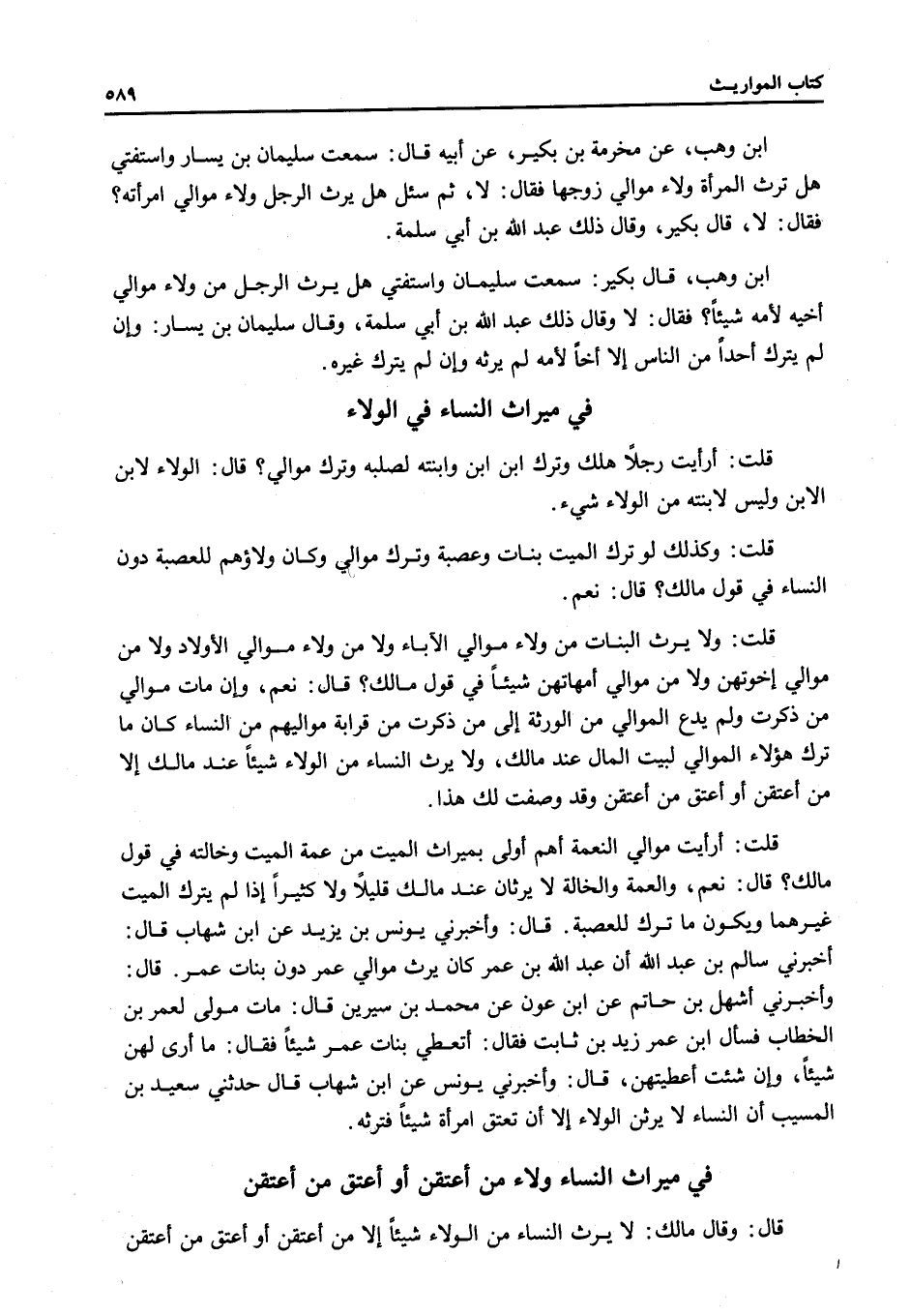 ابْنُ وَهْبٍ، عَنْ مَخْرَمَةَ بْنِ بُكَيْرٍ، عَنْ أَبِيهِ قَالَ: سَمِعْتُ سُلَيْمَانَ بْنَ يَسَارٍ وَاسْتُفْتِيَ هَلْ تَرِثُ الْمَرْأَةُ وَلَاءَ مَوَالِي زَوْجِهَا فَقَالَ: لَا، ثُمَّ سُئِلَ هَلْ يَرِثُ الرَّجُلُ وَلَاءَ مَوَالِي امْرَأَتِهِ؟ فَقَالَ: لَا.