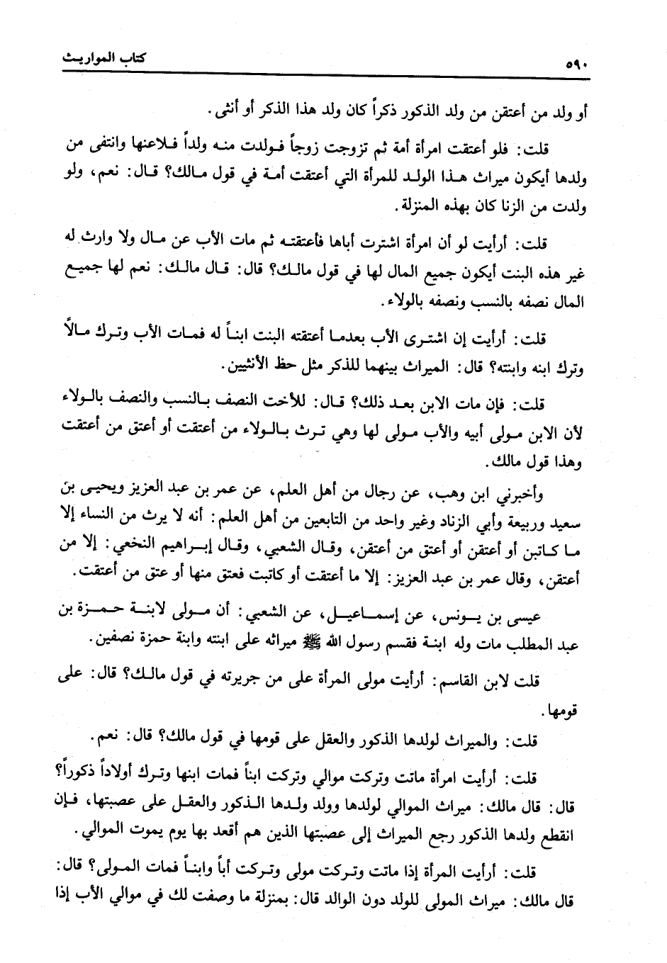 قَالَ: قَالَ مَالِكٌ: مِيرَاثُ الْمَوَالِي لِوَلَدِهَا وَوَلَدِ وَلَدِهَا الذُّكُورِ وَالْعَقْلُ عَلَى عَصَبَتِهَا، فَإِنْ انْقَطَعَ وَلَدُهَا الذُّكُورُ رَجَعَ الْمِيرَاثُ إلَى عَصَبَتِهَا الَّذِينَ هُمْ أَقْعَدُ بِهَا يَوْمَ يَمُوتُ الْمَوَالِي.