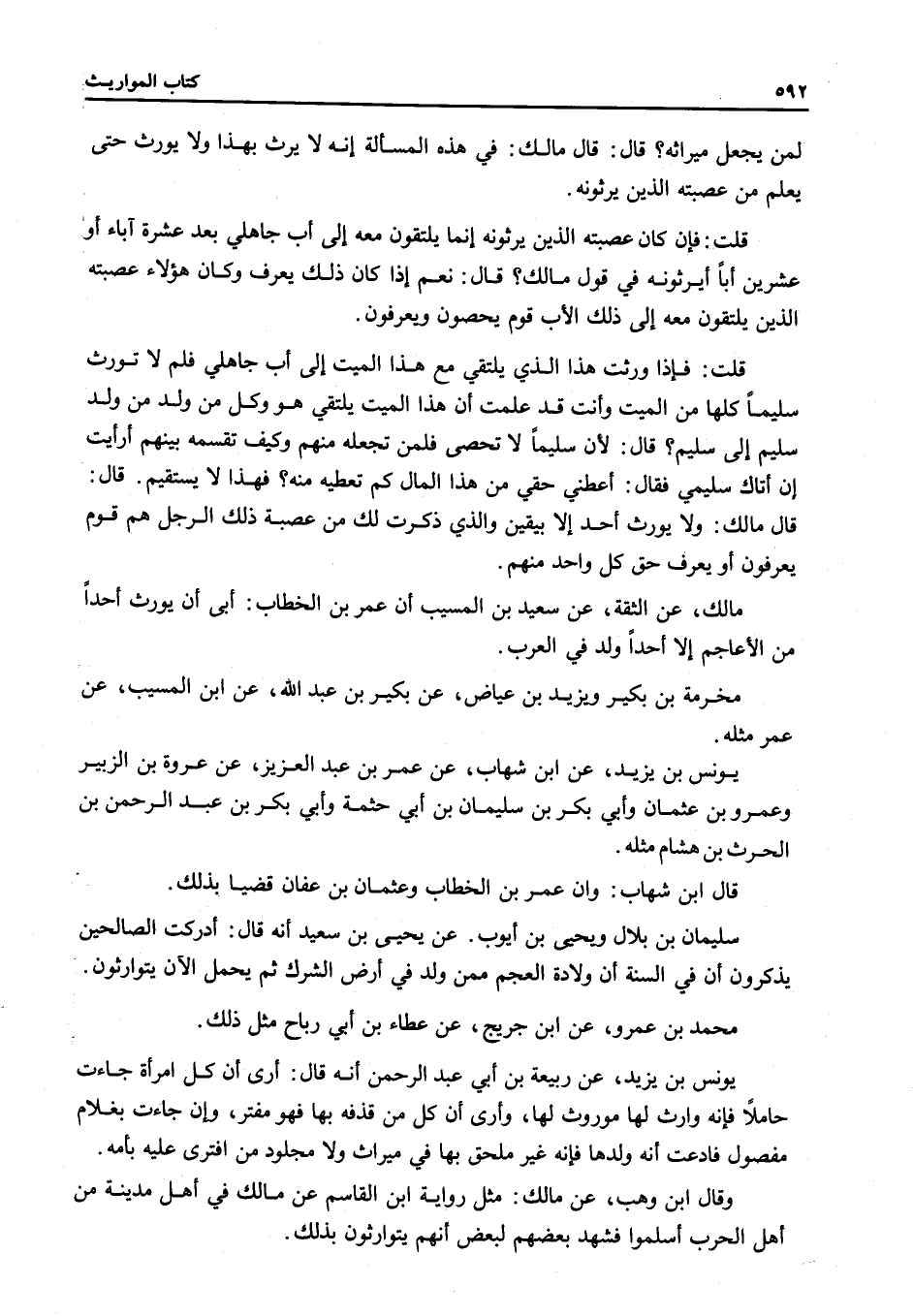 مَالِكٌ، عَنْ الثِّقَةِ، عَنْ سَعِيدِ بْنِ الْمُسَيِّبِ أَنَّ عُمَرَ بْنَ الْخَطَّابِ: أَبَى أَنْ يُوَرِّثَ أَحَدًا مِنْ الْأَعَاجِمِ إلَّا أَحَدًا وُلِدَ فِي الْعَرَبِ. مَخْرَمَةُ بْنُ بُكَيْرٍ وَيَزِيدُ بْنُ عِيَاضٍ، عَنْ بُكَيْرِ بْنِ عَبْدِ اللَّهِ، عَنْ ابْنِ الْمُسَيِّبِ عَنْ عُمَرَ مِثْلُهُ