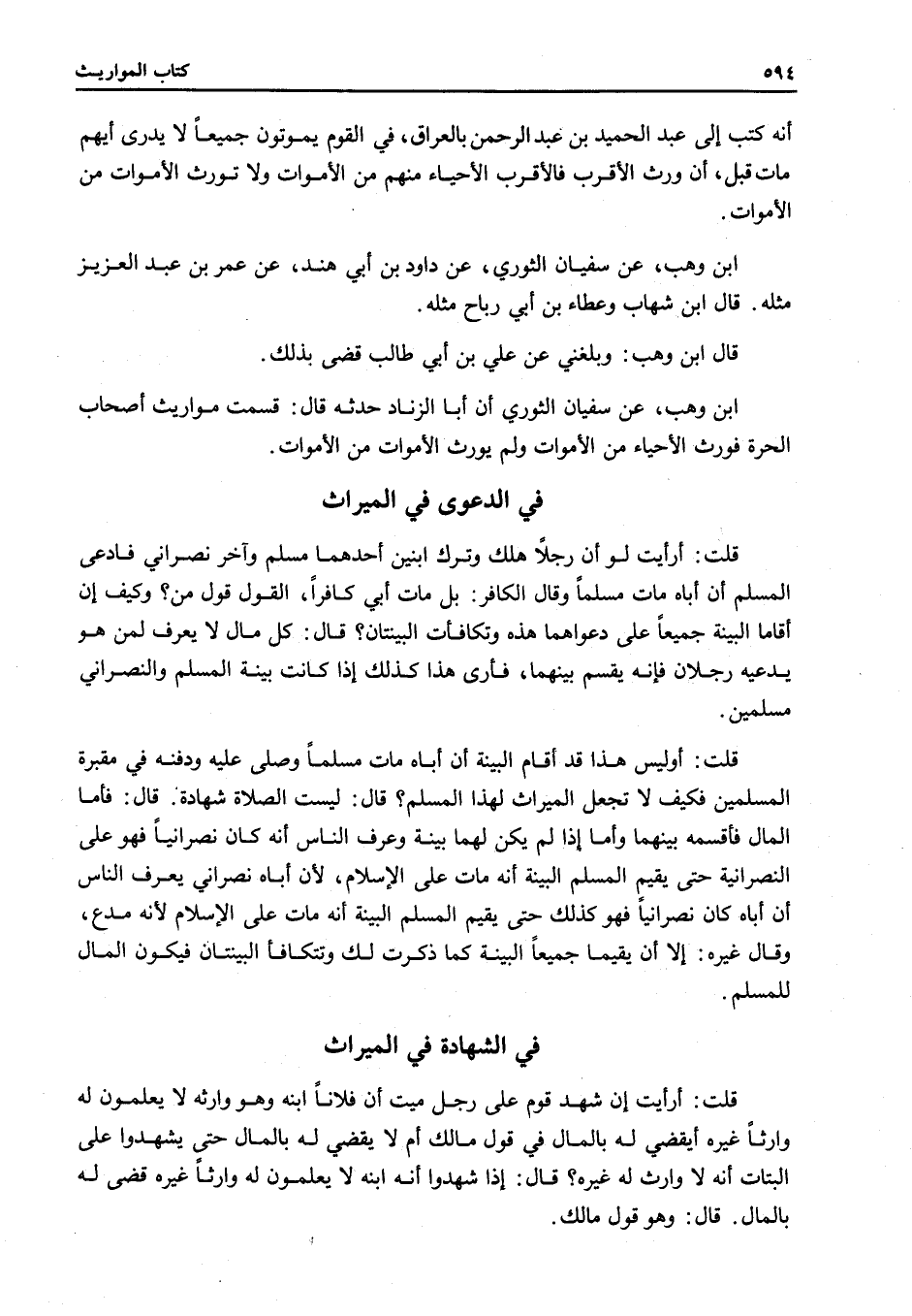 ابْنُ وَهْبٍ، عَنْ سُفْيَانَ الثَّوْرِيِّ أَنَّ أَبَا الزِّنَادِ حَدَّثَهُ قَالَ: قُسِمَتْ مَوَارِيثُ أَصْحَابِ الْحَرَّةِ فَوَرِثَ الْأَحْيَاءُ مِنْ الْأَمْوَاتِ وَلَمْ يُوَرَّثْ الْأَمْوَاتُ مِنْ الْأَمْوَاتِ.