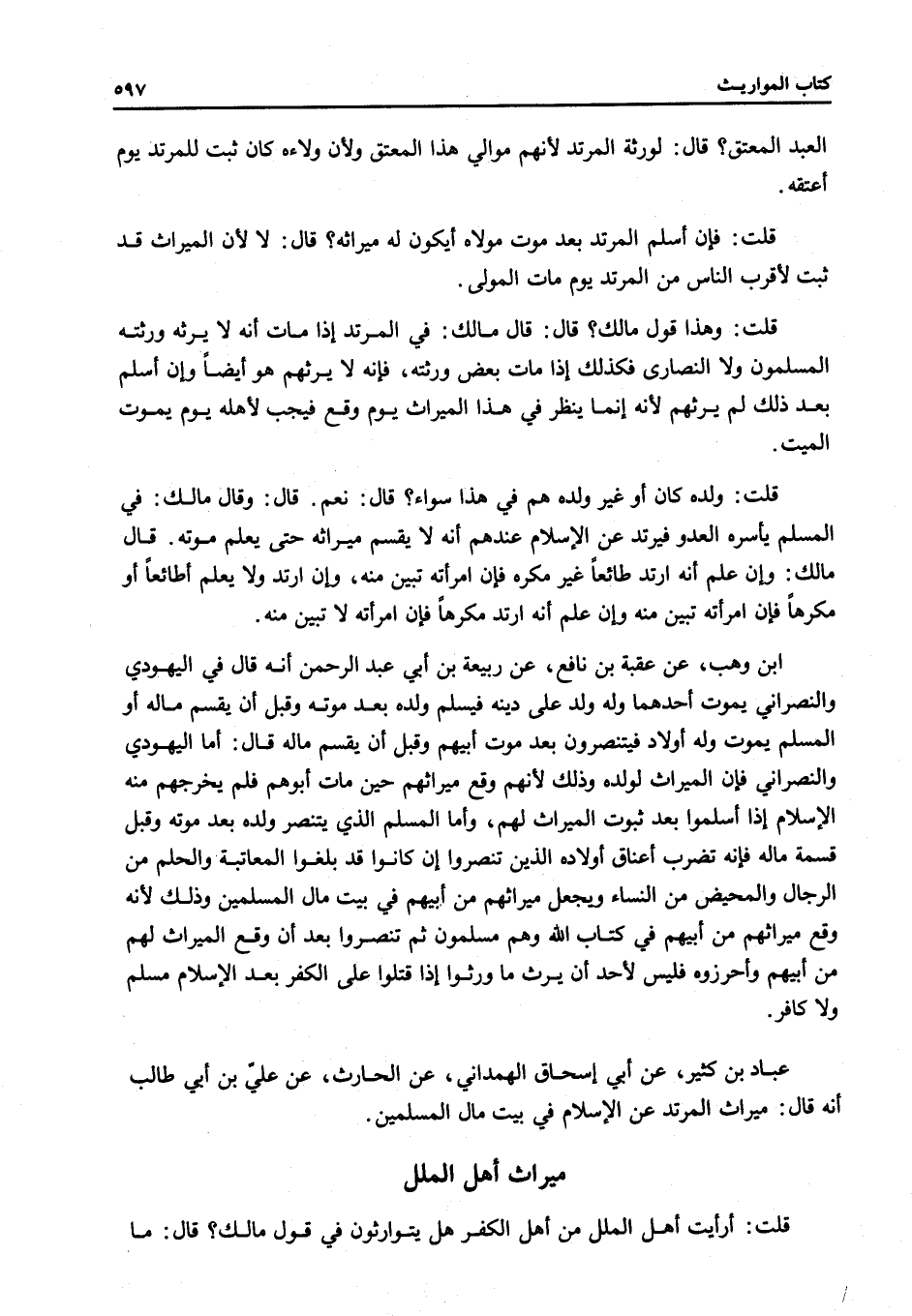 ِ قُلْتُ أَرَأَيْتَ أَهْلَ الْمِلَلِ مِنْ أَهْلِ الْكُفْرِ هَلْ يَتَوَارَثُونَ فِي قَوْلِ مَالِكٍ؟