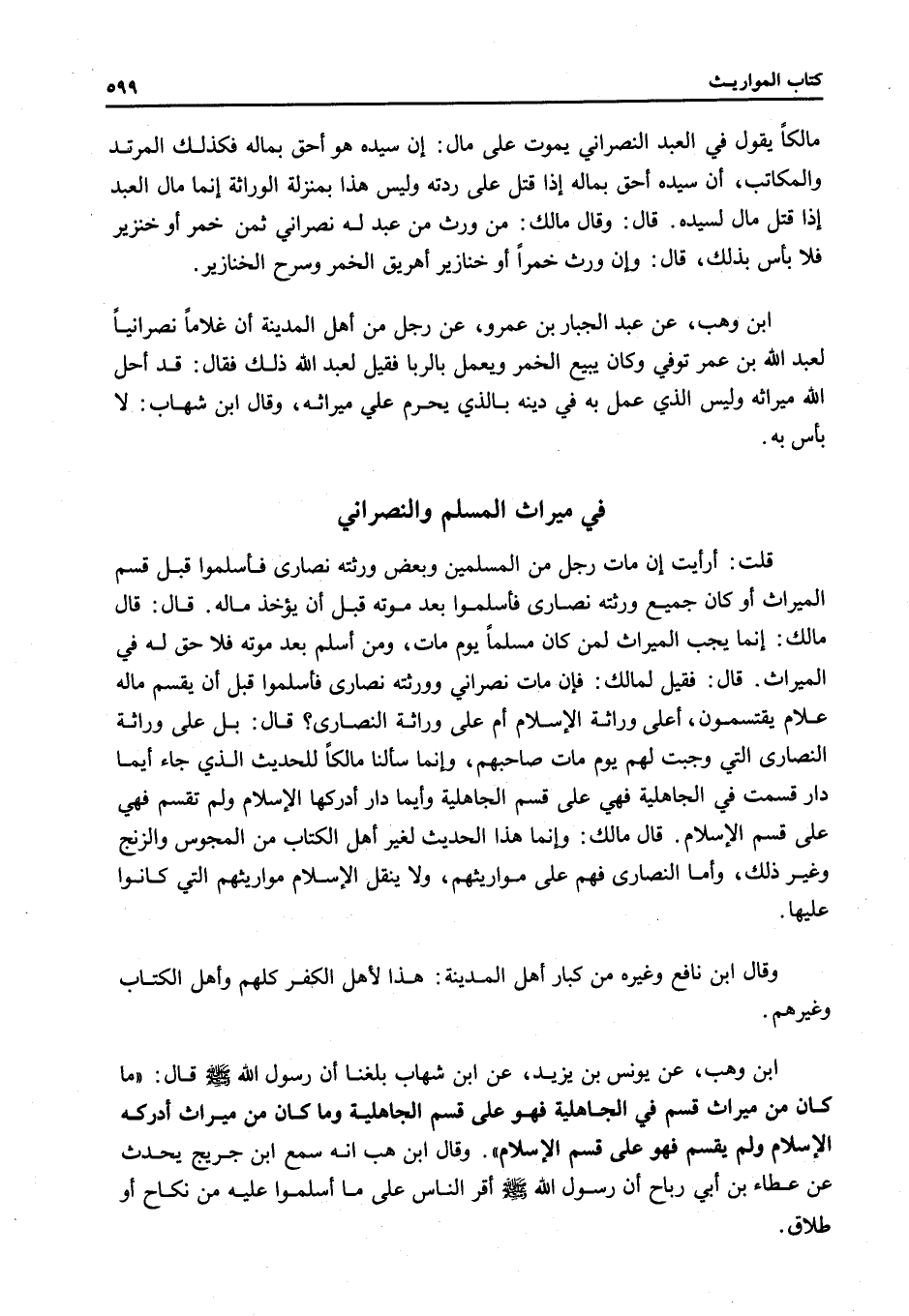 قَالَ: بَلْ عَلَى وِرَاثَةِ النَّصَارَى الَّتِي وَجَبَتْ لَهُمْ يَوْمَ مَاتَ صَاحِبُهُمْ، وَإِنَّمَا سَأَلْنَا مَالِكًا لِلْحَدِيثِ الَّذِي جَاءَ «أَيُّمَا دَارٍ قُسِمَتْ فِي الْجَاهِلِيَّةِ فَهِيَ عَلَى قَسْمِ الْجَاهِلِيَّةِ وَأَيُّمَا دَارٍ أَدْرَكَهَا الْإِسْلَامُ وَلَمْ تُقْسَمْ فَهِيَ عَلَى قَسْمِ الْإِسْلَامِ» .