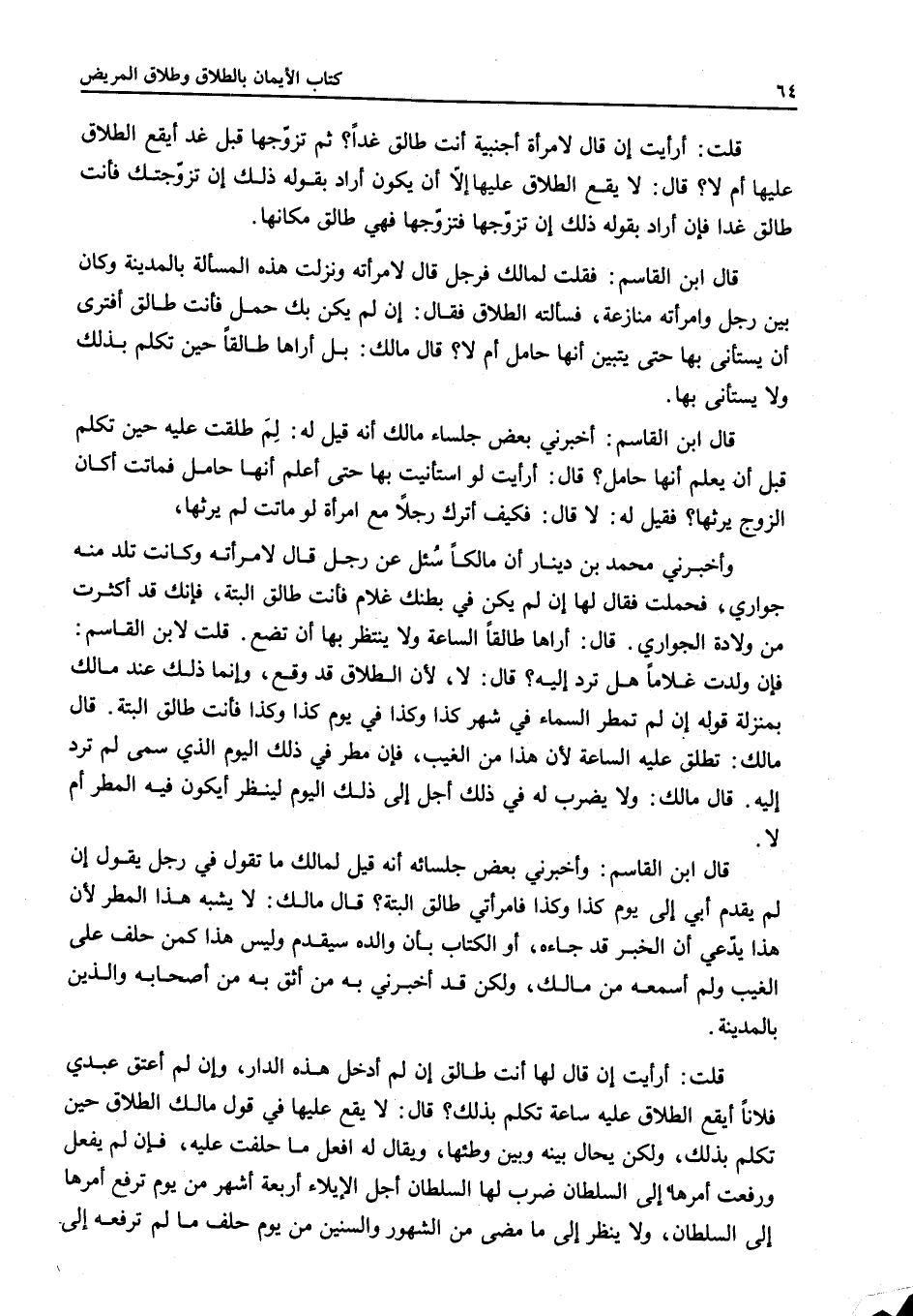 قَالَ ابْنُ الْقَاسِمِ: أَخْبَرَنِي بَعْضُ جُلَسَاءِ مَالِكٍ أَنَّهُ قِيلَ لَهُ: لِمَ طَلَّقْت عَلَيْهِ حِينَ تَكَلَّمَ قَبْلَ أَنْ يَعْلَمَ أَنَّهَا حَامِلٌ؟