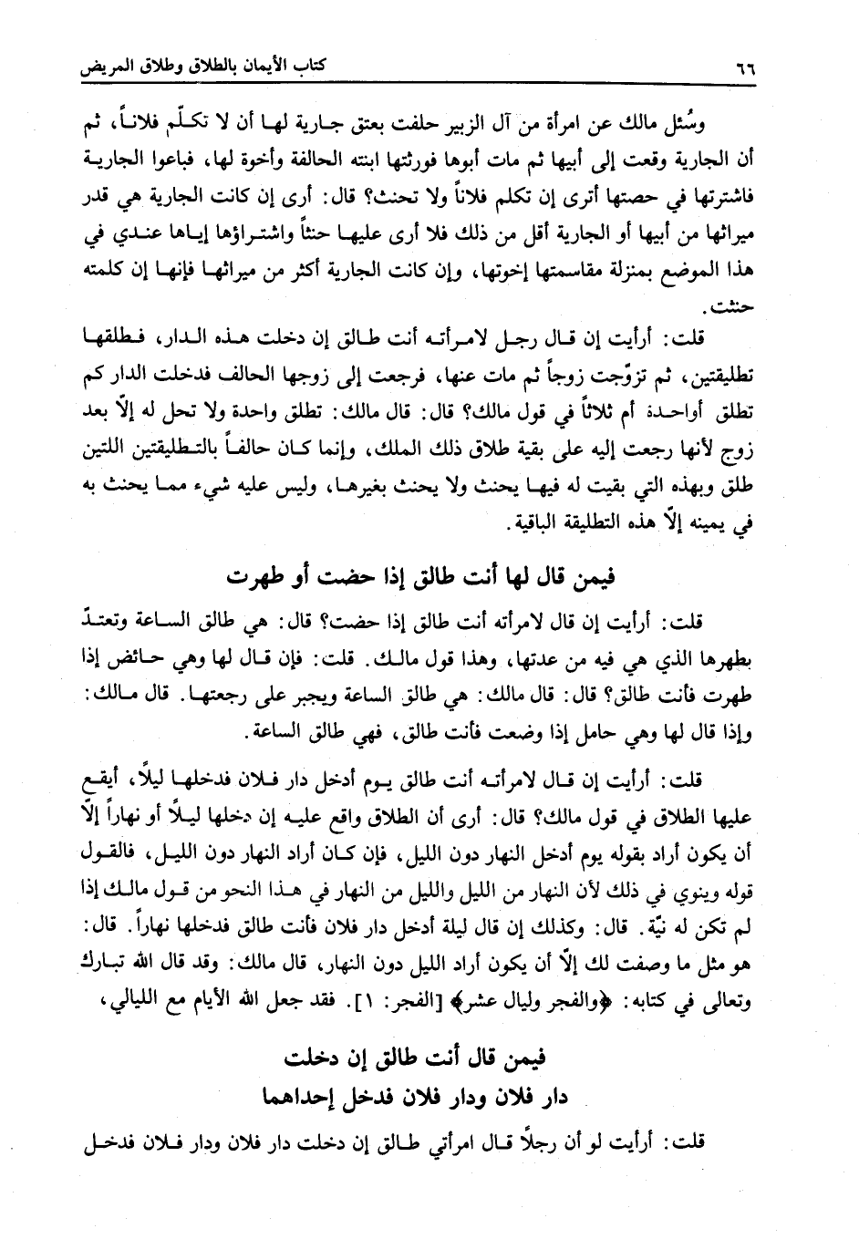 قَالَ: وَكَذَلِكَ إنْ قَالَ: لَيْلَةَ أَدْخُلُ دَارَ فُلَانٍ فَأَنْتِ طَالِقٌ فَدَخَلَهَا نَهَارًا قَالَ: هُوَ مِثْلُ مَا وَصَفْت لَك إلَّا أَنْ يَكُونَ أَرَادَ اللَّيْلَ دُونَ النَّهَارِ، قَالَ مَالِكٌ: وَقَدْ قَالَ اللَّهُ تَبَارَكَ وَتَعَالَى فِي كِتَابِهِ {وَالْفَجْرِ} [الفجر: 1] {وَلَيَالٍ عَشْرٍ} [الفجر: 2] . فَقَدْ جَعَلَ اللَّهُ الْأَيَّامَ مَعَ اللَّيَالِي.