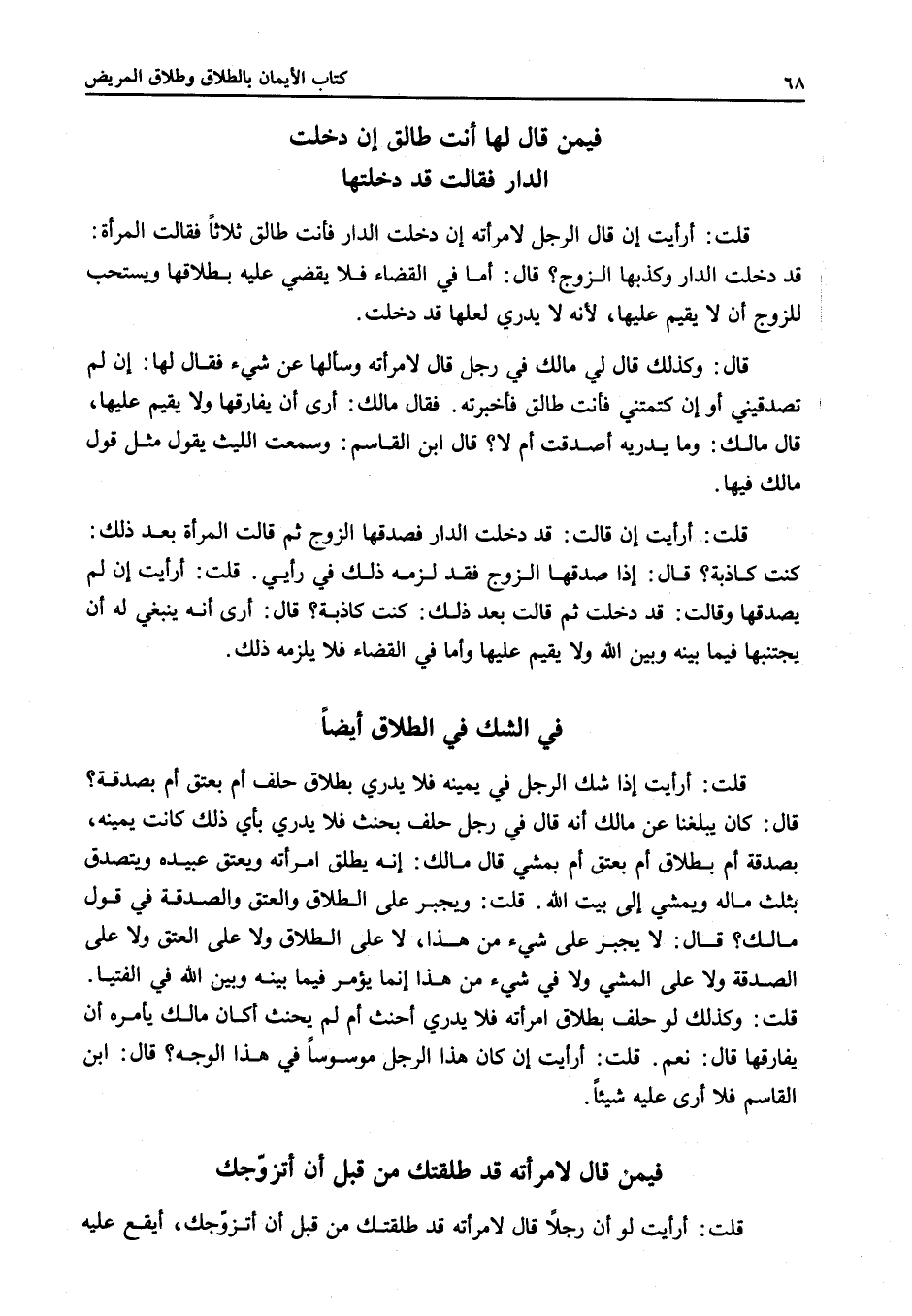 فِي الشَّكِّ فِي الطَّلَاقِ أَيْضًا قُلْتُ: أَرَأَيْتَ إذَا شَكَّ الرَّجُلُ فِي يَمِينِهِ فَلَا يَدْرِي بِطَلَاقٍ حَلَفَ أَمْ بِعِتْقٍ أَمْ بِصَدَقَةٍ؟ قَالَ: كَانَ يَبْلُغُنَا عَنْ مَالِكٍ أَنَّهُ قَالَ: فِي رَجُلٍ حَلَفَ بِحِنْثٍ فَلَا يَدْرِي بِأَيِّ ذَلِكَ كَانَتْ يَمِينُهُ، بِصَدَقَةٍ أَمْ بِطَلَاقٍ أَمْ بِعِتْقٍ أَمْ بِمَشْيٍ؟ قَالَ مَالِكٌ: إنَّهُ يُطَلِّقُ امْرَأَتَهُ وَيُعْتِقُ عَبِيدَهُ وَيَتَصَدَّقُ بِثُلُثِ مَالِهِ وَيَمْشِي إلَى بَيْتِ اللَّهِ.
