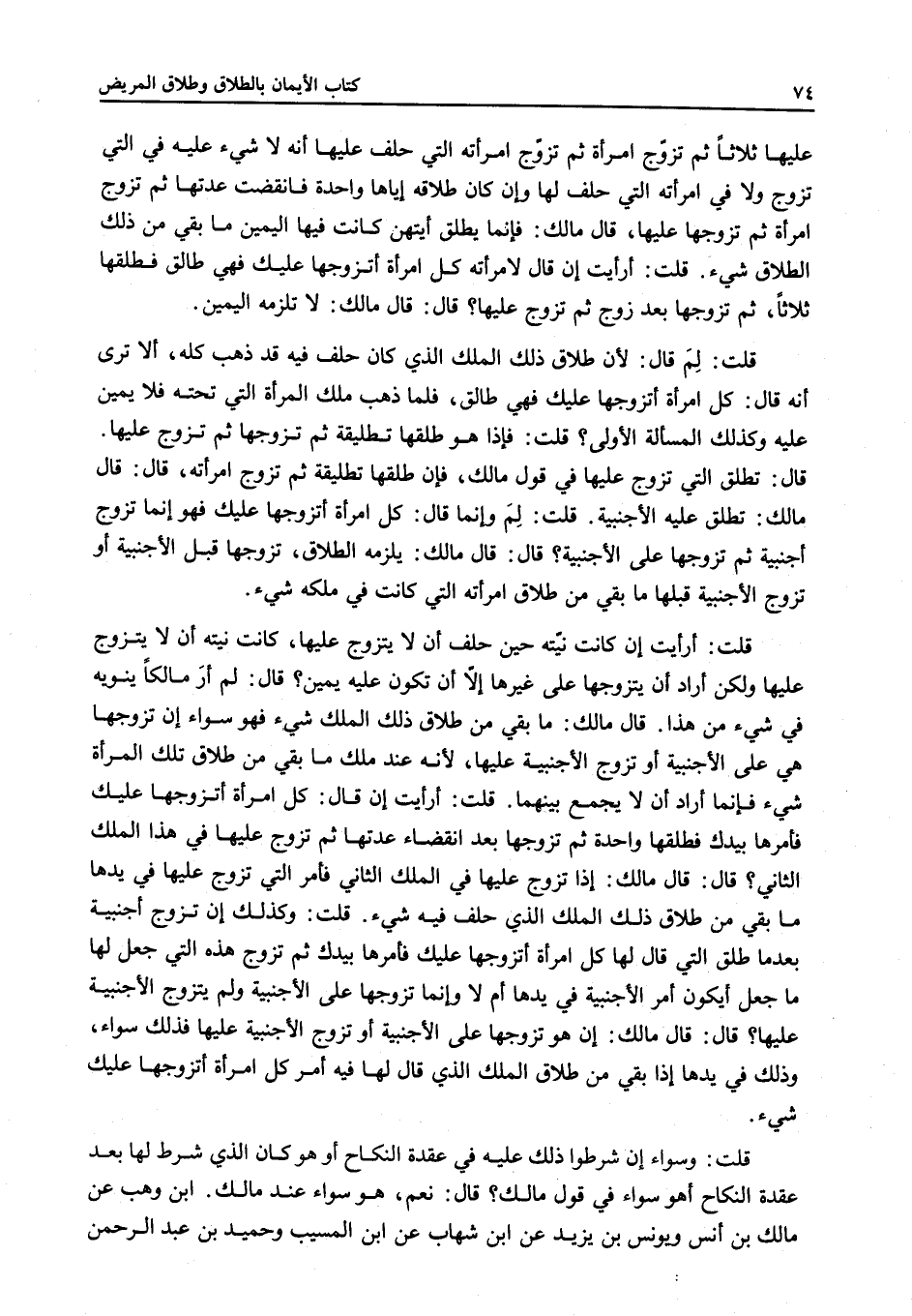 عَلَيْهَا ثَلَاثًا ثُمَّ تَزَوَّجَ امْرَأَةً ثُمَّ تَزَوَّجَ امْرَأَتَهُ الَّتِي حَلَفَ عَلَيْهَا أَنَّهُ لَا شَيْءَ عَلَيْهِ فِي الَّتِي تَزَوَّجَ وَلَا فِي امْرَأَتِهِ الَّتِي حَلَفَ لَهَا وَإِنْ كَانَ طَلَاقُهُ إيَّاهَا وَاحِدَةً فَانْقَضَتْ عِدَّتُهَا ثُمَّ تَزَوَّجَ امْرَأَةً ثُمَّ تَزَوَّجَهَا عَلَيْهَا، قَالَ مَالِكٌ: فَإِنَّمَا يُطَلِّقُ أَيَّتَهنَّ كَانَتْ فِيهَا الْيَمِينُ مَا بَقِيَ مِنْ ذَلِكَ الطَّلَاقِ شَيْءٌ، قُلْتُ: أَرَأَيْتَ إنْ قَالَ: لِامْرَأَتِهِ كُلُّ امْرَأَةٍ أَتَزَوَّجُهَا عَلَيْك فَهِيَ طَالِقٌ فَطَلَّقَهَا ثَلَاثًا، ثُمَّ تَزَوَّجَهَا بَعْدَ زَوْجٍ ثُمَّ تَزَوَّجَ عَلَيْهَا قَالَ: قَالَ: مَالِكٌ: لَا تَلْزَمُهُ الْيَمِينُ