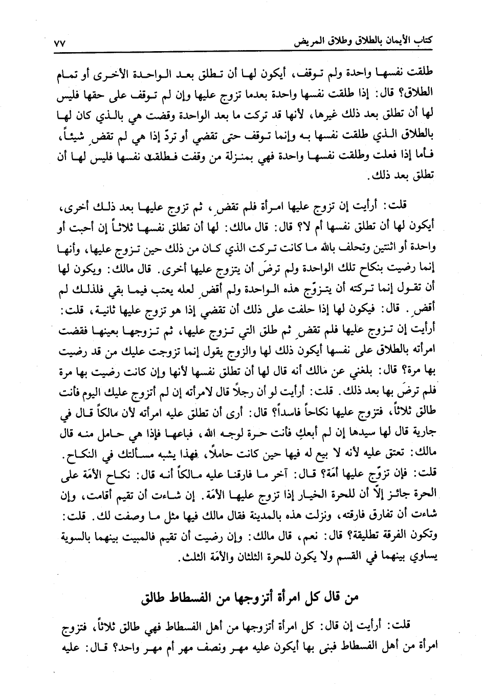 قُلْتُ: أَرَأَيْتَ إنْ تَزَوَّجَ عَلَيْهَا امْرَأَةً فَلَمْ تَقْضِ، ثُمَّ تَزَوَّجَ عَلَيْهَا بَعْدَ ذَلِكَ أُخْرَى، أَيَكُونُ لَهَا أَنْ تُطَلِّقَ نَفْسَهَا أَمْ لَا؟ .