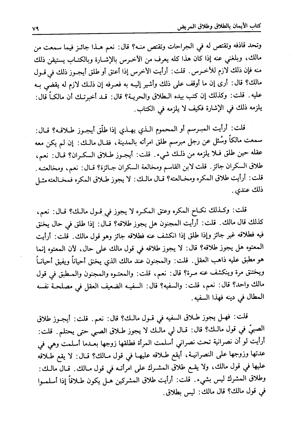 قُلْتُ: أَرَأَيْتَ الْمَعْتُوهَ هَلْ يَجُوزُ طَلَاقُهُ؟ قَالَ: لَا يَجُوزُ طَلَاقُهُ فِي قَوْلِ مَالِكٍ عَلَى حَالٍ؛ لِأَنَّ الْمَعْتُوهَ إنَّمَا هُوَ مُطْبَقٌ عَلَيْهِ ذَاهِبُ الْعَقْلِ قُلْتُ: وَالْمَجْنُونُ عِنْدَ مَالِكٍ الَّذِي يُخْنَقُ أَحْيَانَا وَيُفِيقُ أَحْيَانَا وَيَخْتَنِقُ مَرَّةً وَيَنْكَشِفُ عَنْهُ مَرَّةً؟