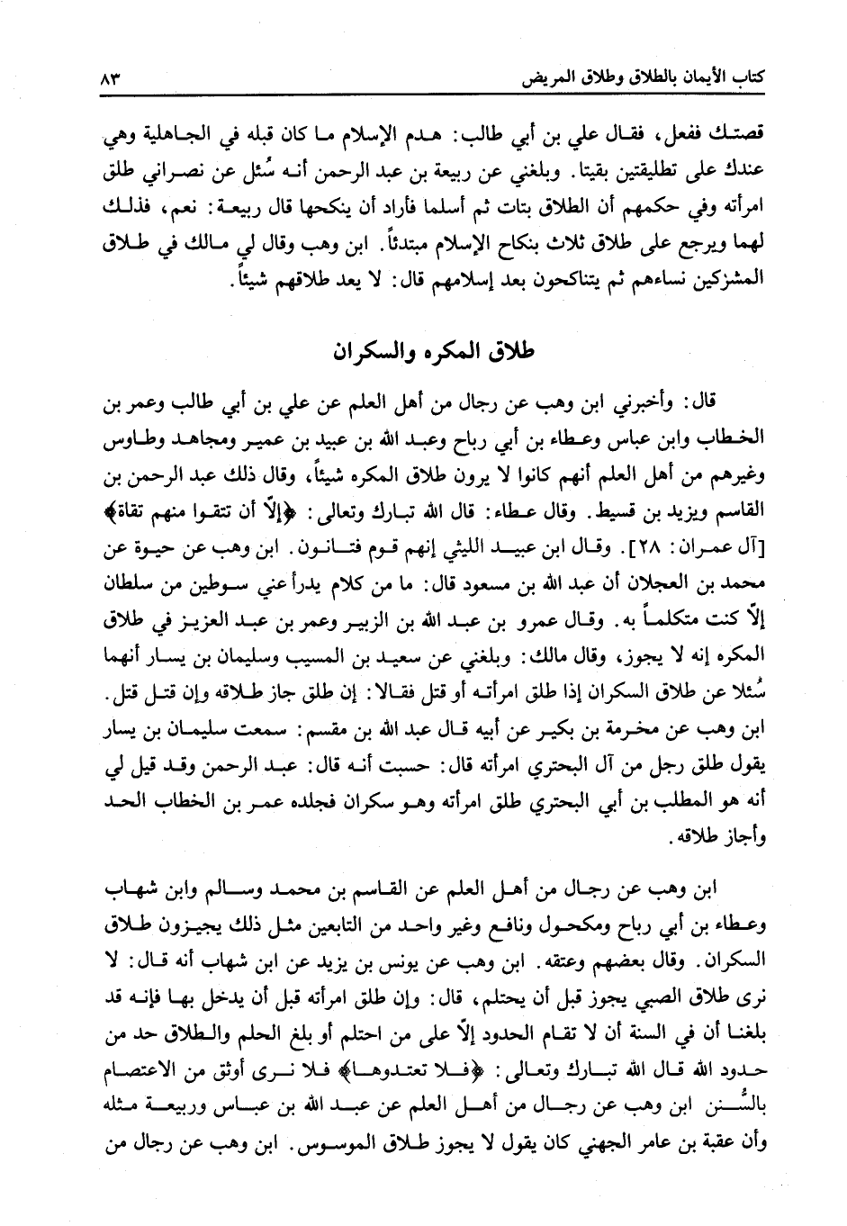 ِ قَالَ: وَأَخْبَرَنِي ابْنُ وَهْبٍ عَنْ رِجَالٍ مِنْ أَهْلِ الْعِلْمِ عَنْ عَلِيِّ بْنِ أَبِي طَالِبٍ وَعُمَرَ بْنِ الْخَطَّابِ وَابْنِ عَبَّاسٍ وَعَطَاءِ بْنِ أَبِي رَبَاحٍ وَعَبْدِ اللَّهِ بْنِ عُبَيْدِ بْنِ عُمَيْرٍ وَمُجَاهِدٍ وَطَاوُسٍ وَغَيْرِهِمْ مِنْ أَهْلِ الْعِلْمِ أَنَّهُمْ كَانُوا لَا يَرَوْنَ طَلَاقَ الْمُكْرَهِ شَيْئًا، وَقَالَ ذَلِكَ عَبْدُ الرَّحْمَنِ بْنُ الْقَاسِمِ وَيَزِيدُ بْنُ قُسَيْطٍ وَقَالَ عَطَاءٌ قَالَ اللَّهُ تَبَارَكَ وَتَعَالَى {إلَّا أَنْ تَتَّقُوا مِنْهُمْ تُقَاةً} [آل عمران: 28]