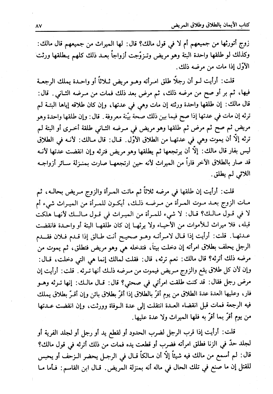 قُلْتُ: أَرَأَيْتَ إنْ طَلَّقَهَا فِي مَرَضِهِ ثَلَاثًا ثُمَّ مَاتَتْ الْمَرْأَةُ وَالزَّوْجُ مَرِيضٌ بِحَالِهِ، ثُمَّ مَاتَ الزَّوْجُ بَعْدَ مَوْتِ الْمَرْأَةِ مِنْ مَرَضِهِ ذَلِكَ، أَيَكُونُ لِلْمَرْأَةِ مِنْ الْمِيرَاثِ شَيْءٌ أَمْ لَا فِي قَوْلِ مَالِكٍ؟