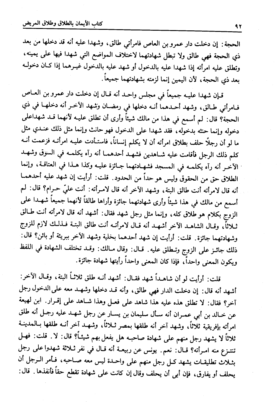 قُلْتُ: أَرَأَيْتَ لَوْ أَنَّ شَاهِدًا شَهِدَ فَقَالَ: أَشْهَدُ أَنَّهُ طَلَّقَ ثَلَاثًا أَلْبَتَّةَ وَقَالَ الْآخَرُ أَشْهَدُ أَنَّهُ قَالَ: إنْ دَخَلْت الدَّارَ فَهِيَ طَالِقٌ، وَأَنَّهُ قَدْ دَخَلَهَا وَشَهِدَ مَعَهُ عَلَى الدُّخُولِ رَجُلٌ آخَرُ؟ فَقَالَ: لَا تَطْلُقُ هَذِهِ عَلَيْهِ هَذَا شَاهِدٌ عَلَى فِعْلٍ وَهَذَا شَاهِدٌ عَلَى إقْرَارٍ ابْنُ لَهِيعَةَ عَنْ خَالِدِ بْنِ أَبِي عِمْرَانَ أَنَّهُ سَأَلَ سُلَيْمَانَ بْنَ يَسَارٍ عَنْ رَجُلٍ شَهِدَ عَلَيْهِ رَجُلٌ أَنَّهُ طَلَّقَ امْرَأَتَهُ بِإِفْرِيقِيَّةَ ثَلَاثًا، وَشَهِدَ آخَرُ أَنَّهُ طَلَّقَهَا بِمِصْرَ ثَلَاثًا، وَشَهِدَ آخَرُ أَنَّهُ طَلَّقَهَا بِالْمَدِينَةِ ثَلَاثًا لَا يَشْهَدُ رَجُلٌ مِنْهُمْ عَلَى شَهَادَةِ صَاحِبِهِ هَلْ يُفْعَلُ بِهِمْ شَيْئًا؟ قَالَ لَا قُلْتُ: فَهَلْ تُنْتَزَعُ مِنْهُ امْرَأَتُهُ؟ قَالَ نَعَمْ.