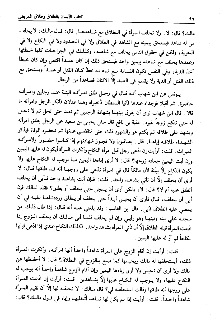 قَالَ: لَا، وَلَا تَحْلِفُ الْمَرْأَةُ فِي الطَّلَاقِ مَعَ شَاهِدِهَا قَالَ: قَالَ مَالِكٌ: لَا يَحْلِفُ مَنْ لَهُ شَاهِدٌ فَيَسْتَحِقُّ بِيَمِينِهِ مَعَ الشَّاهِدِ فِي الطَّلَاقِ وَلَا فِي الْحُدُودِ وَلَا فِي النِّكَاحِ وَلَا فِي الْحُرِّيَّةِ، وَلَكِنْ فِي حُقُوقِ النَّاسِ يَحْلِفُ مَعَ شَاهِدِهِ، وَكَذَلِكَ فِي الْجِرَاحَاتِ كُلِّهَا خَطَئِهَا وَعَمْدِهَا يَحْلِفُ مَعَ شَاهِدِهِ بِيَمِينٍ وَاحِدٍ فَيَسْتَحِقُّ ذَلِكَ إنْ كَانَ عَمْدًا اُقْتُصَّ، وَإِنْ كَانَ خَطَأً أَخَذَ الدِّيَةَ، وَفِي النَّفْسِ تَكُونُ الْقَسَامَةُ مَعَ شَاهِدِهِ خَطَأً كَانَ الْقَتْلُ أَوْ عَمْدًا وَيَسْتَحِقُّ مَعَ ذَلِكَ الْقَتْلَ أَوْ الدِّيَةَ، وَلَا يَقْسِمُ فِي الْعَمْدِ إلَّا الِاثْنَانِ فَصَاعِدًا مِنْ الرِّجَالِ