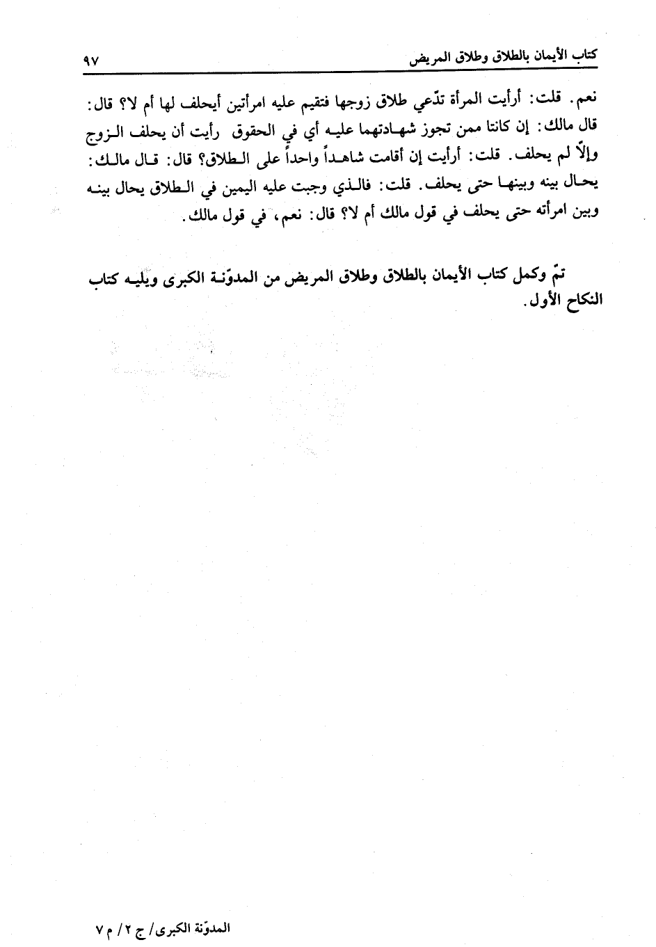 قُلْتُ: فَاَلَّذِي وَجَبَتْ عَلَيْهِ الْيَمِينُ فِي الطَّلَاقِ يُحَالُ بَيْنَهُ وَبَيْنَ امْرَأَتِهِ حَتَّى يَحْلِفَ فِي قَوْلِ مَالِكٍ أَمْ لَا؟ قَالَ: نَعَمْ، فِي قَوْلِ مَالِكٍ
