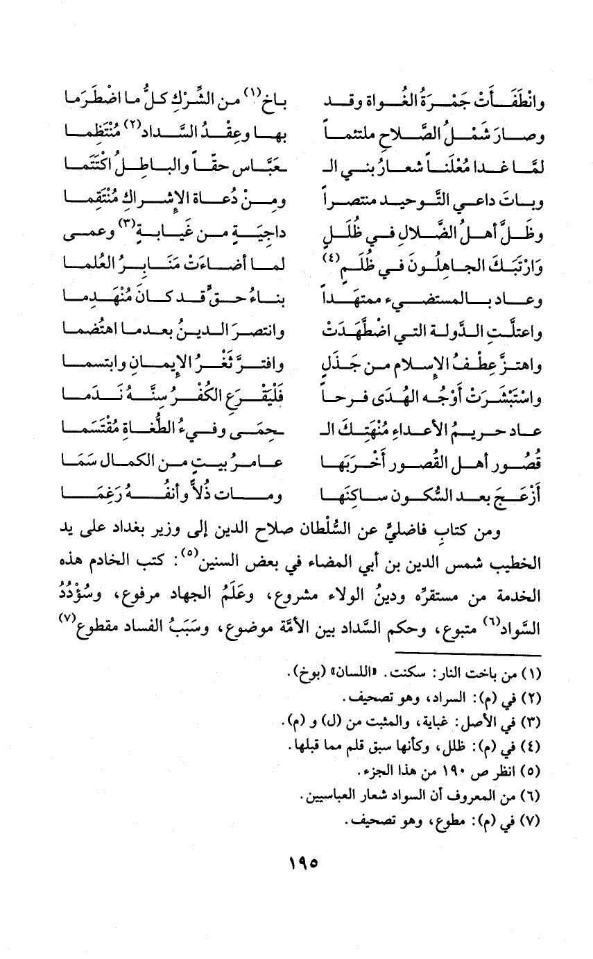 وَمن كتاب فاضلي عَن السُّلْطَان صَلَاح الدّين إِلَى وَزِير بَغْدَاد على يَد الْخَطِيب شمس الدّين بن أبي المضاء فِي بعض السنين كتب الْخَادِم هَذِه الْخدمَة من مستقره وَدين الْوَلَاء مَشْرُوع وَعلم الْجِهَاد مَرْفُوع وسؤدد السوَاد متبوع وَحكم السداد بَين الْأمة مَوْضُوع وَسبب الْفساد مَقْطُوع