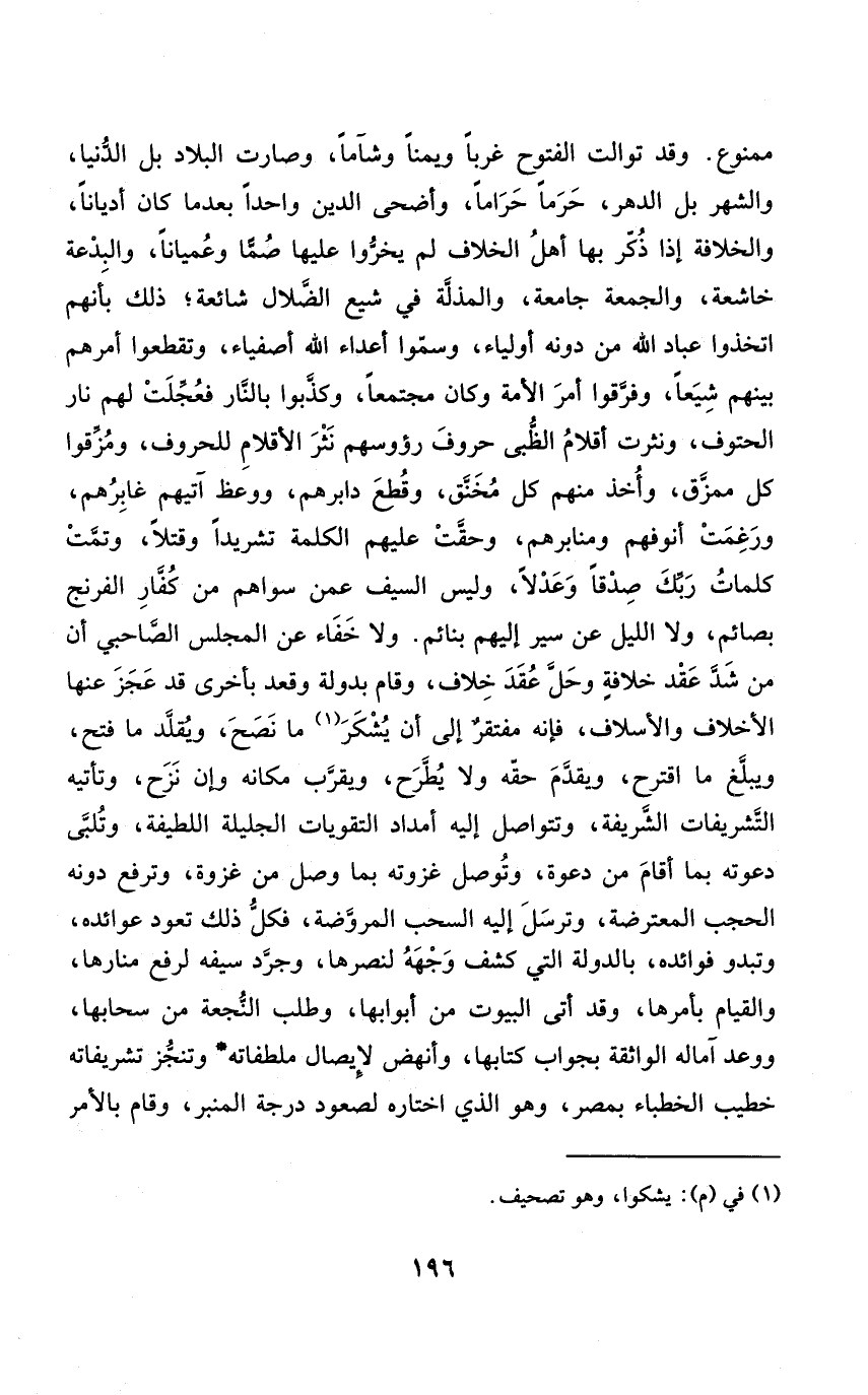 مَمْنُوع وَقد توالت الْفتُوح غرباً ويمناً وشآما وَصَارَت الْبِلَاد بل الدُّنْيَا والشهر بل الدَّهْر حرما حَرَامًا وأضحى الدّين وَاحِدًا بَعْدَمَا كَانَ أديانا والخلافة إِذا ذكر بهَا أهل الْخلاف لم يخروا عَلَيْهَا صُمَّاً وعُميانا والبدعة خاشعة وَالْجُمُعَة جَامِعَة والمذلة فِي شيع الضلال شائعة ذَلِك بِأَنَّهُم أتخذوا عباد الله من دونه أَوْلِيَاء وَسموا أَعدَاء الله أصفياء وتقطعوا أَمرهم بَينهم شيعًا وَفرقُوا أَمر الْأمة وَكَانَ مجتمعا وكذبوا بالنَّار فعجلت لَهُم نَار الحتوف وَنَثَرت أَقْلَام الظبى حُرُوف رؤوسهم نثر الأقلام للحروف ومزقوا كل ممزق وَأخذ مِنْهُم كل مخنق وَقطع دابرهم وَوعظ آتيهم غابرهم ورغمت أنوفهم ومنابرهم وحقت عَلَيْهِم الْكَلِمَة تشريدا وقتلا وتمَّت كَلِمَات رَبِّكَ صِدْقا وَعَدْلاً وَلَيْسَ السَّيْف عَمَّن سواهُم من كفار الفرنج بصائم وَلَا اللَّيْل عَن سير إِلَيْهِم بنائم وَلَا خَفَاء عَن الْمجْلس الصاحبي أَن من شدّ عقد خلَافَة وحلّ عقد خلاف وَقَامَ بدولة وَقعد بِأُخْرَى قد عجز عَنْهَا الأخلاف والأسلاف فَإِنَّهُ مفتقر إِلَى أَن يُشكر مَا نصح ويُقلَّد مَا فتح ويبَّلغ مَا أقترح وَيقدم حَقه وَلَا يطرَّح وَيقرب مَكَانَهُ وَإِن نزح وتأتيه التشريفات الشَّرِيفَة وتتواصل إِلَيْهِ أَمْدَاد التقويات الجليلة اللطيفة وتُلَّبى دَعوته بِمَا أَقَامَ من دَعْوَة وتوصل غزوته بِمَا وصل من غَزْوَة وترفع دونه الْحجب المعترضة وَترسل إِلَيْهِ السحب المروضة فَكل ذَلِك تعود عوائده وتبدو فَوَائده بالدولة الَّتِي كشف وَجهه لنصرها وجرد سَيْفه لرفع منارها وَالْقِيَام بأمرها وَقد أَتَى الْبيُوت من أَبْوَابهَا وَطلب النجعة من سحابها ووعد آماله الواثقة بِجَوَاب كتابها وأنهض لإيصال ملطفاته وتنجز تشريفاته خطيب الخطباء بِمصْر وَهُوَ الَّذِي اخْتَارَهُ لصعود دَرَجَة الْمِنْبَر وَقَامَ بِالْأَمر