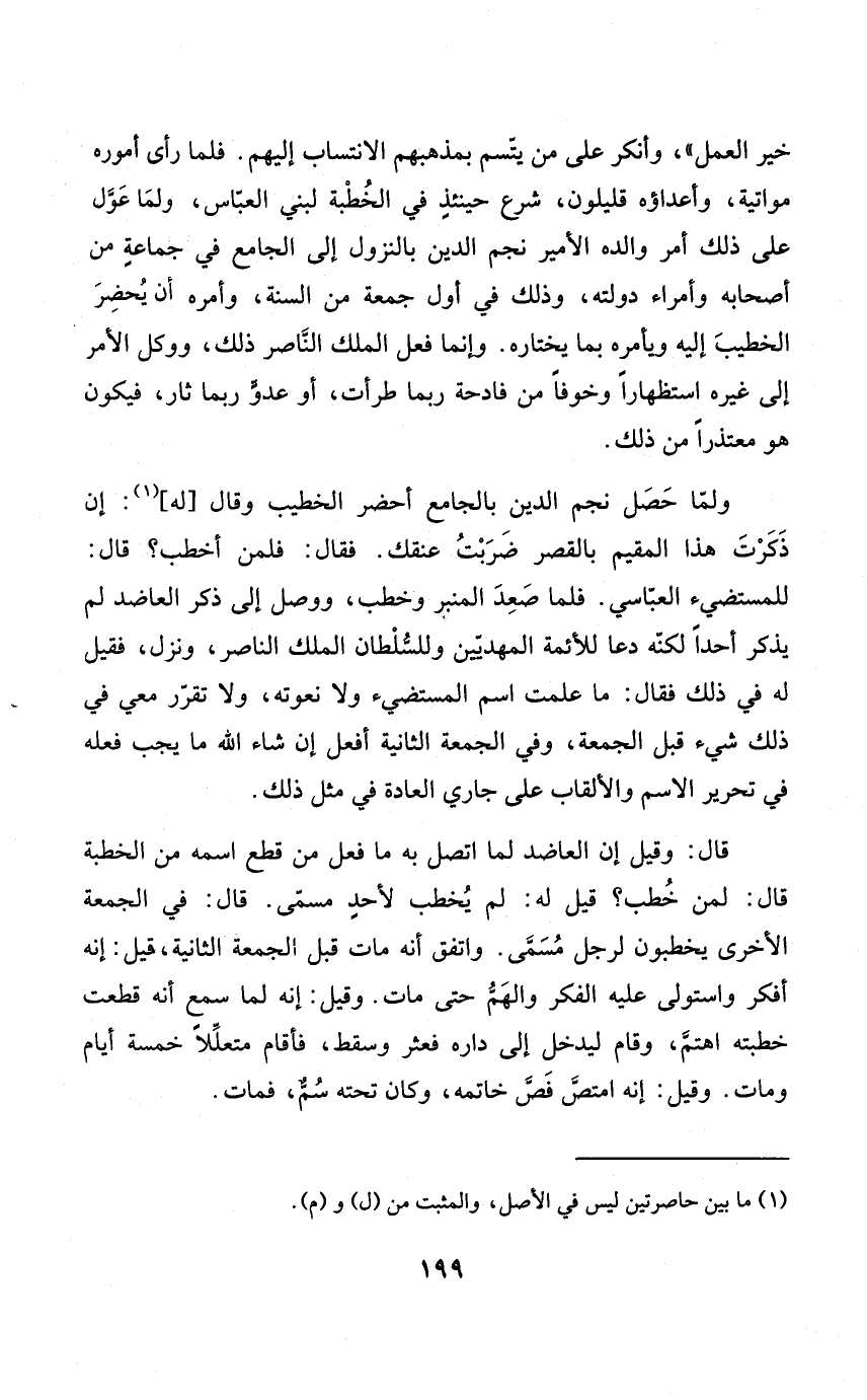 خير الْعَمَل وَأنكر على من يتسم بمذهبهم الانتساب إِلَيْهِم فَلَمَّا رأى أُمُوره مواتية وأعداؤه قَلِيلُونَ شرع حِينَئِذٍ فِي الْخطْبَة لبني الْعَبَّاس وَلما عول على ذَلِك أَمر وَالِده الْأَمِير نجم الدّين بالنزول إِلَى الْجَامِع فِي جمَاعَة من أَصْحَابه وأمراء دولته وَذَلِكَ فِي أول جُمُعَة من السّنة وَأمره أَن يحضر الْخَطِيب إِلَيْهِ ويأمره بِمَا يختاره وَإِنَّمَا فعل الْملك النَّاصِر ذَلِك ووكل الْأَمر إِلَى غَيره استظهارا وخوفا من فادحة رُبمَا طرأت أَو عَدو رُبمَا ثار فَيكون هُوَ معتذرا من ذَلِك