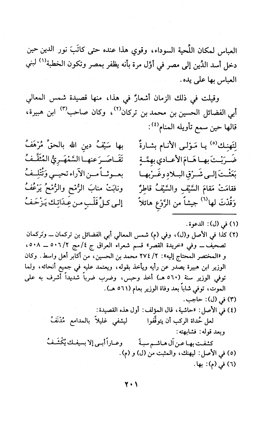 وقيلت فِي ذَلِك الزَّمَان أشعار فِي هَذَا مِنْهَا قصيدة شمس الْمَعَالِي أبي الْفَضَائِل الْحُسَيْن بن مُحَمَّد بن ترْكَان وَكَانَ صَاحب ابْن هُبَيْرَة قَالَهَا حِين سمع تَأْوِيله الْمَنَام