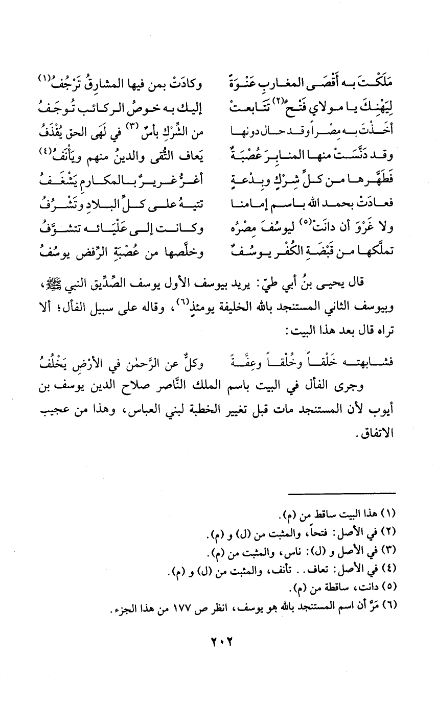 قَالَ يحيى بن أبي طيّ يُرِيد بِيُوسُف الأول يُوسُف الصّديق النَّبِي صلى الله عَلَيْهِ وَسلم وبيوسف الثَّانِي المستنجد بِاللَّه الْخَلِيفَة يَوْمئِذٍ وَقَالَهُ على سَبِيل الفأل أَلا ترَاهُ قَالَ بعد هَذَا الْبَيْت