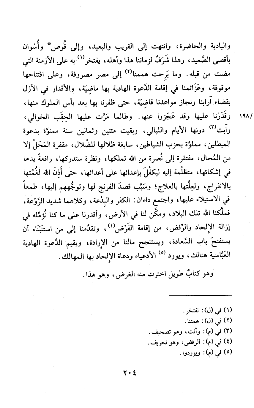 والبادية والحاضرة وانتهت إِلَى الْقَرِيب والبعيد وَإِلَى قوص وأسوان بأقصى الصَّعِيد وَهَذَا شرف لزماننا هَذَا وَأَهله يفتخر بِهِ على الْأَزْمِنَة الَّتِي مَضَت من قبله وَمَا بَرحت هممنا إِلَى مصر مصروفة وعَلى افتتاحها مَوْقُوفَة وعزائمنا فِي إِقَامَة الدعْوَة الهادية بهَا مَاضِيَة والأقدار فِي الْأَزَل بِقَضَاء آرابنا ونجاز مواعدنا قاضية حَتَّى ظفرنا بهَا بعد يأس الْمُلُوك مِنْهَا وقدرنا عَلَيْهَا وَقد عجزوا عَنْهَا وطالما مرت عَلَيْهَا الحقب الخوالي وآبت دونهَا الْأَيَّام والليالي وَبقيت مئتين وَثَمَانِينَ سنة ممنوَّة بدعوة المبطلين مملوَّة بحزب الشَّيَاطِين سابغة ظلالها للضلال مقفرة الْمحل إِلَّا من الْمحَال مفتقرة إِلَى نصْرَة من الله تَملكهَا ونظرة ستدركها رَافِعَة يَدهَا فِي إشكائها متظلمة إِلَيْهِ ليكفل بإعدائها على أعدائها حَتَّى أذن الله لغُمتها بالانفراج ولعلتها بالعلاج وسبَّب قصد الفرنج لَهَا وتوجههم إِلَيْهَا طَمَعا فِي الِاسْتِيلَاء عَلَيْهَا وَاجْتمعَ داءان الْكفْر والبدعة وَكِلَاهُمَا شَدِيد الروعة فملكنا الله تِلْكَ الْبِلَاد ومكنّ لنا فِي الأَرْض وأقدرنا على مَا كُنَّا نؤمله فِي إِزَالَة الالحاد والرفض من إِقَامَة الْفَرْض وتقدمنا إِلَى من استنَبنْاه أَن يستفتح بَاب السَّعَادَة ويستنجح مَا لنا من الْإِرَادَة وَيُقِيم الدعْوَة الهادية العباسية هُنَالك ويورد الأدعياء ودعاة الْإِلْحَاد بهَا المهالك