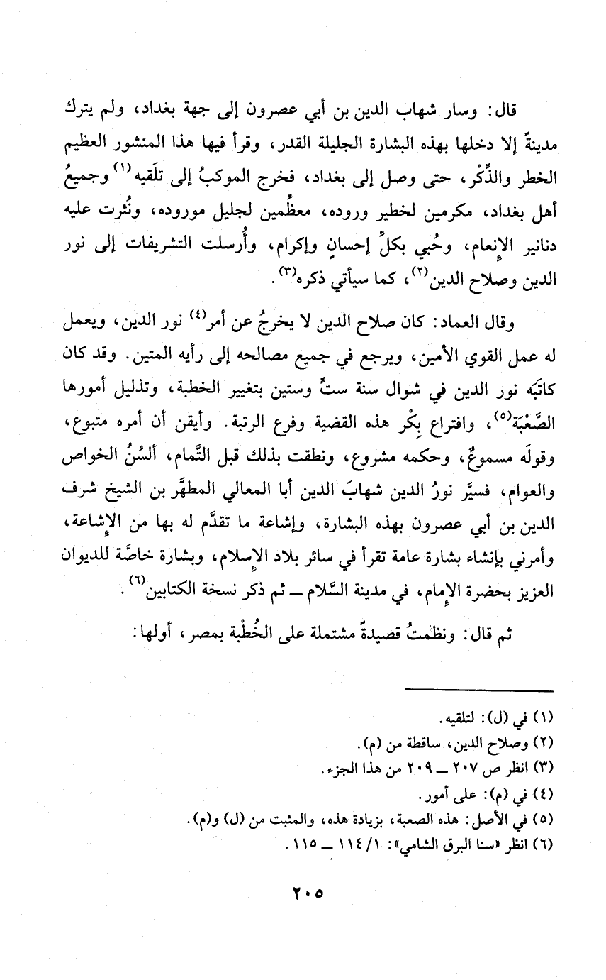وَقَالَ الْعِمَاد كَانَ صَلَاح الدّين لَا يخرج عَن أَمر نور الدّين وَيعْمل لَهُ عمل القوى الْأمين وَيرجع فِي جَمِيع مَصَالِحه إِلَى رَأْيه المتين وَقد كَانَ كَاتبه نور الدّين فِي شَوَّال سنة سِتّ وَسِتِّينَ بتغيير الْخطْبَة وتذليل أمورها الصعبة وافتراع بكر هَذِه الْقَضِيَّة وَفرع الرُّتْبَة وأيقن أَن أمره متبوع وَقَوله مسموع وَحكمه مَشْرُوع ونطقت بذلك قبل التَّمام ألسُن الْخَواص والعوام فسيَّر نور الدّين شهَاب الدّين بن أَبَا الْمَعَالِي المطهر بن الشَّيْخ شرف الدّين بن أبي عصرون بِهَذِهِ الْبشَارَة وإشاعة مَا تقدم لَهُ بهَا من الإشاعة وَأَمرَنِي بإنشاء بِشَارَة عَامَّة تقْرَأ فِي سَائِر بِلَاد الْإِسْلَام وَبشَارَة خَاصَّة للديوان الْعَزِيز بِحَضْرَة الإِمَام فِي مَدِينَة السَّلَام ثمَّ ذكر نُسْخَة الْكِتَابَيْنِ