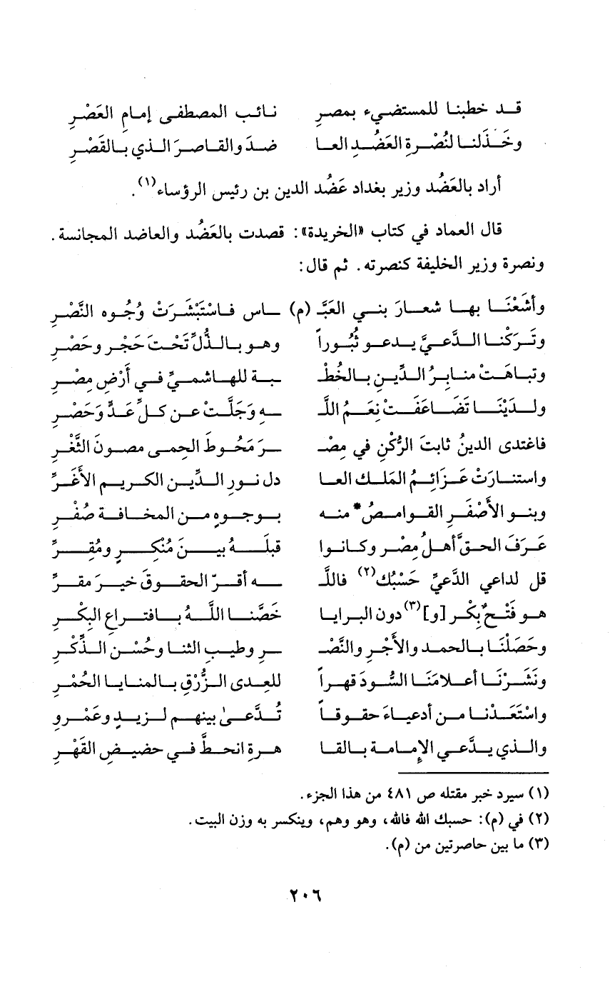 (قد خَطَبنَا للمستضيء بِمصْر ... نَائِب الْمُصْطَفى إِمَام الْعَصْر)