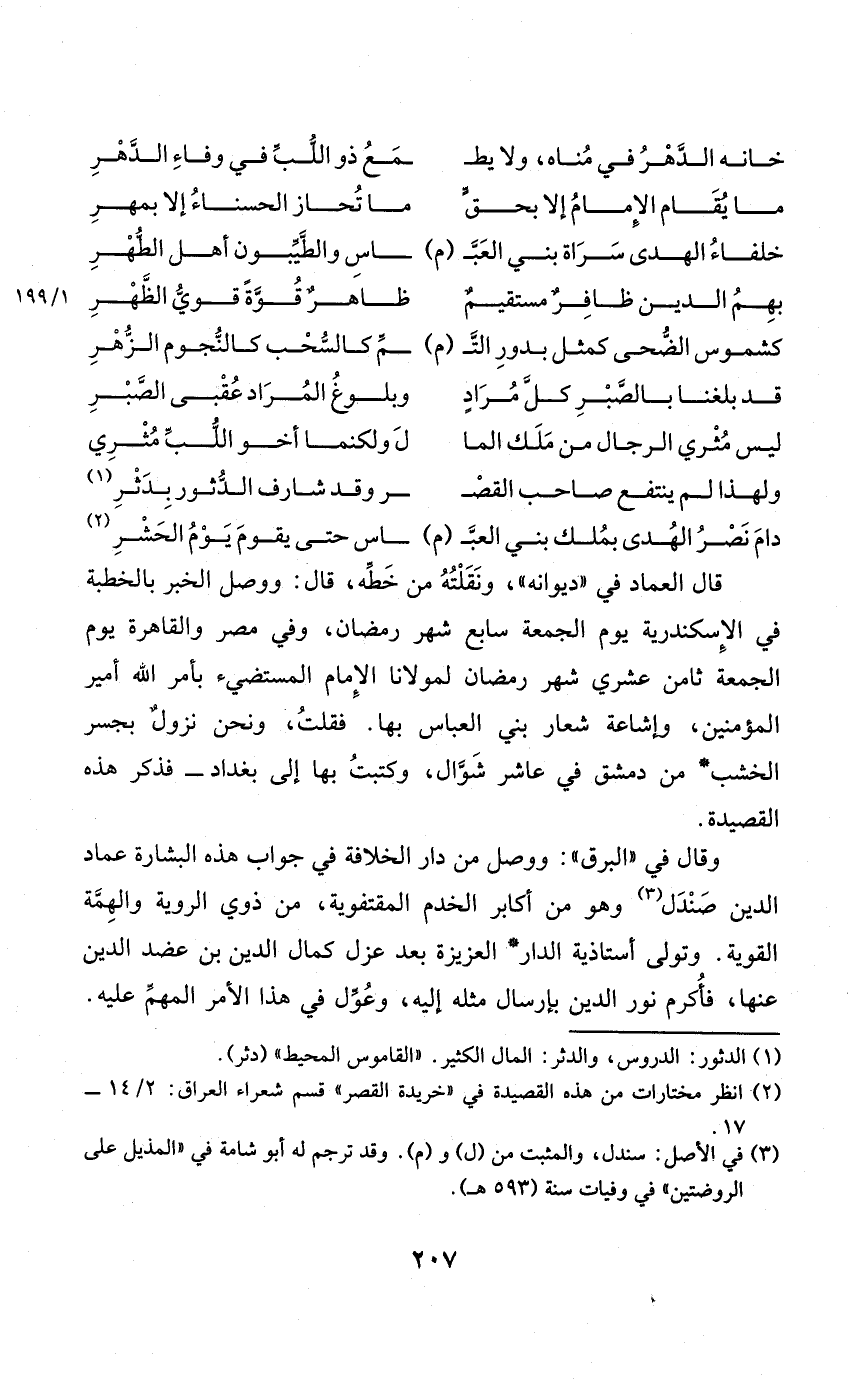 قَالَ الْعِمَاد فِي ديوانه ونقلته من خطه قَالَ وَوصل الْخَبَر بِالْخطْبَةِ فِي الْإسْكَنْدَريَّة يَوْم الْجُمُعَة سَابِع شهر رَمَضَان وَفِي مصر والقاهرة يَوْم الْجُمُعَة ثامن عشري شهر رَمَضَان لمولانا الإِمَام المستضيء بِأَمْر الله أَمِير الْمُؤمنِينَ وإشاعة شعار بني الْعَبَّاس بهَا فَقلت وَنحن نزُول بجسر الْخشب من دمشق فِي عَاشر شَوَّال وكتبت بهَا إِلَى بَغْدَاد فَذكر هَذِه القصيدة