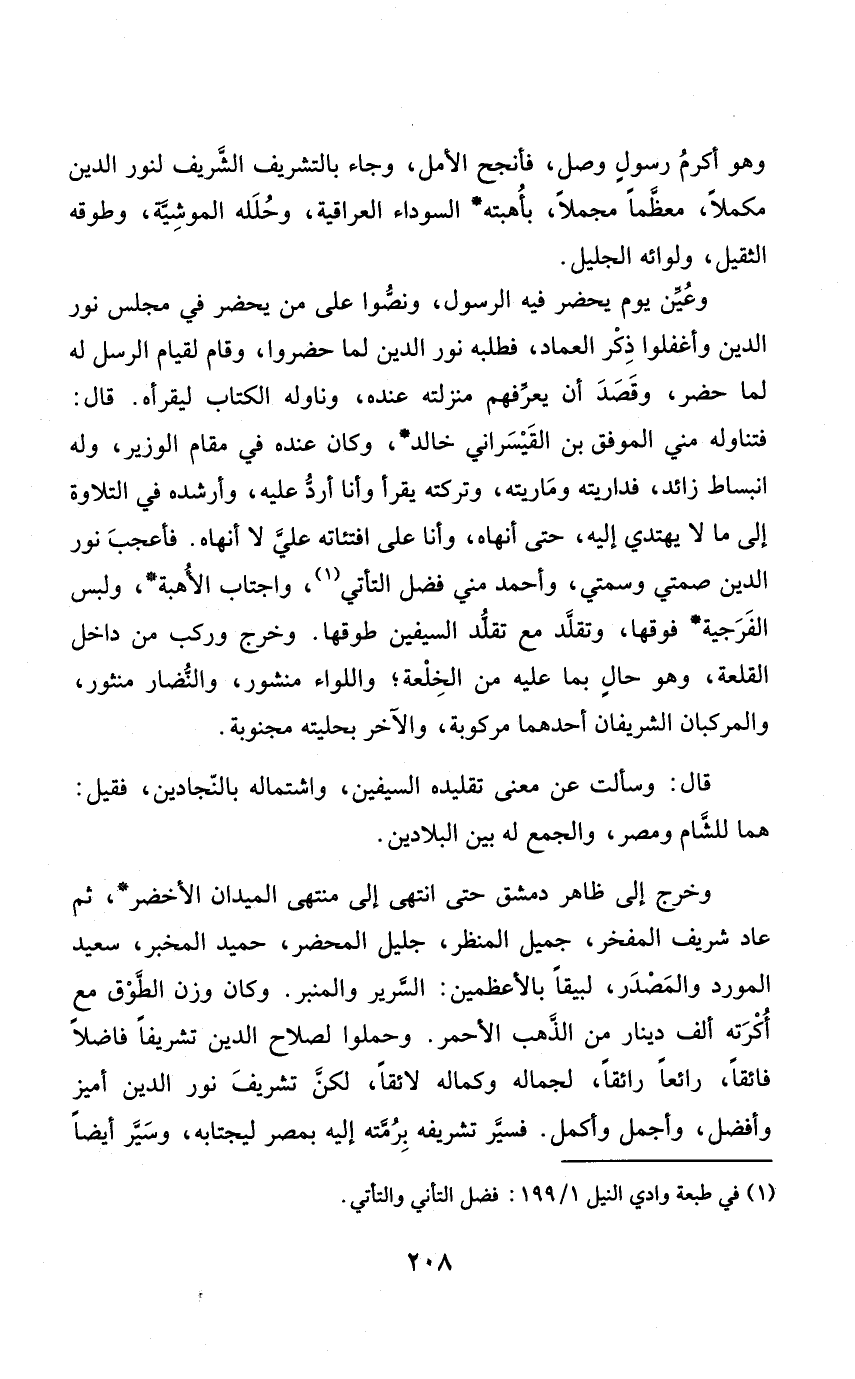 وَعين يَوْم يحضر فِيهِ الرَّسُول ونصوا على من يحضر فِي مجْلِس نور الدّين وأغفلوا ذكر الْعِمَاد فَطَلَبه نور الدّين لما حَضَرُوا وَقَامَ لقِيَام الرُّسُل لَهُ لما حضر وَقصد أَن يعرفهُمْ مَنْزِلَته عِنْده وناوله الْكتاب ليقرأه قَالَ فتناوله منى الْمُوفق بن القيسراني خَالِد وَكَانَ عِنْده فِي مقَام الْوَزير وَله انبساط زَائِد فداريته وماريته وَتركته يقْرَأ وَأَنا أرد عَلَيْهِ وأرشده فِي التِّلَاوَة إِلَى مَا لَا يَهْتَدِي إِلَيْهِ حَتَّى أنهاه وَأَنا على افتئاته عليّ لَا أنهاه فأعجب نور الدّين صمتي وسمتي وَأحمد مني فضل التأتي واجتاب الأهبة وَلبس الفرجية فَوْقهَا وتقلد مَعَ تقلد السيفين طوقها وَخرج وَركب من دَاخل القلعة وَهُوَ حالٍ بِمَا عَلَيْهِ من الخلعة واللواء منشور والنضار منثور والمركبان الشريفان أَحدهمَا مركوبه وَالْآخر بحليته مجنوبه