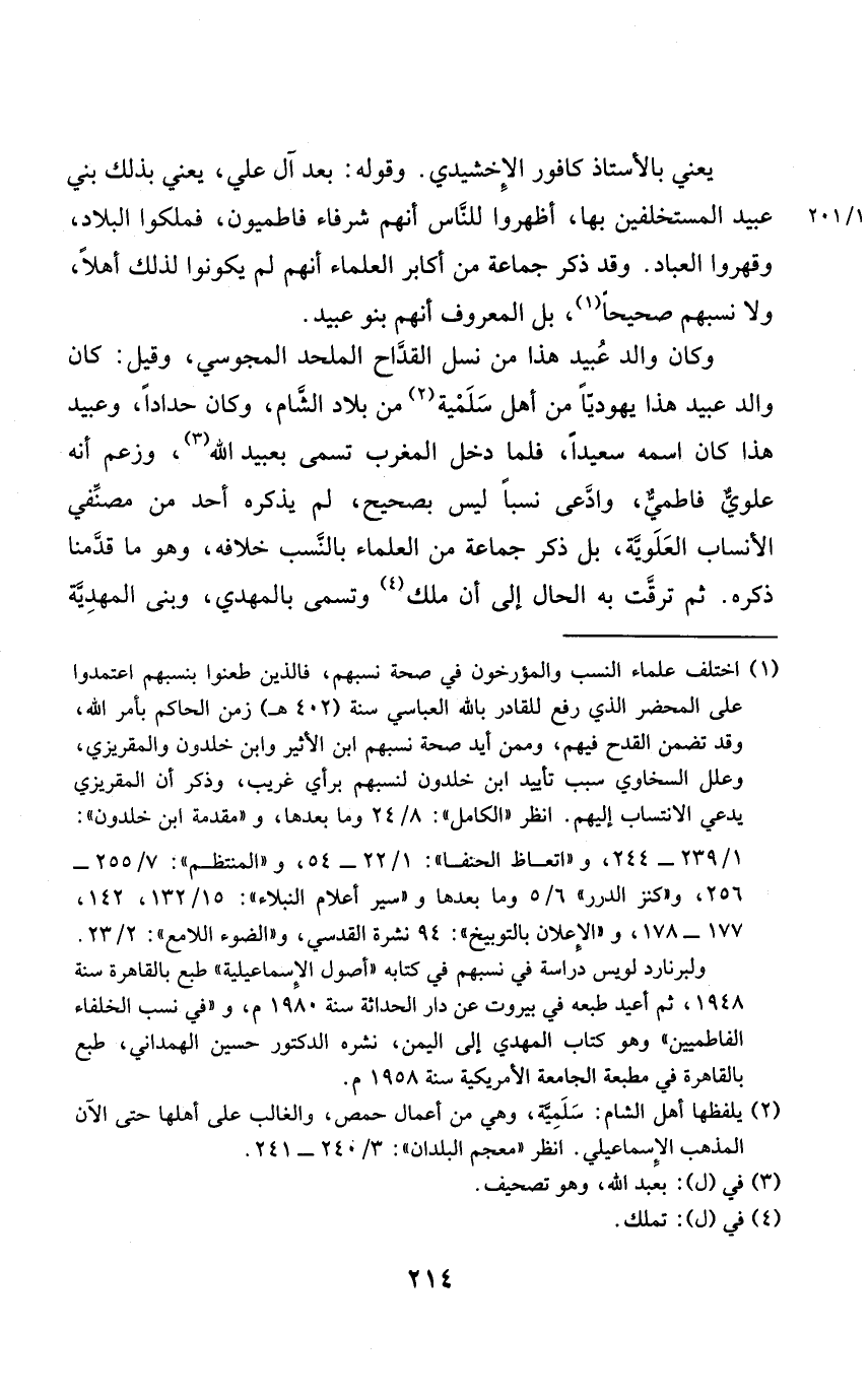 وَكَانَ وَالِد عبيد هَذَا من نسل القداح الملحد الْمَجُوسِيّ وَقيل كَانَ وَالِد عبيد هَذَا يَهُودِيّا من أهل سَلَمْية من بِلَاد الشَّام وَكَانَ حدادا وَعبيد هَذَا كَانَ اسْمه سعيداً فَلَمَّا دخل الْمغرب تسمى بعبيد الله وَزعم أَنه علويّ فاطميّ وَادّعى نسبا لَيْسَ بِصَحِيح لم يذكرهُ أحد من مصنفي الْأَنْسَاب العلوية بل ذكر جمَاعَة من الْعلمَاء بِالنّسَبِ خِلَافه وَهُوَ مَا قدمنَا ذكره ثمَّ ترقت بِهِ الْحَال إِلَى أَن ملك وَتسَمى بالمهدي وَبني المهدية
