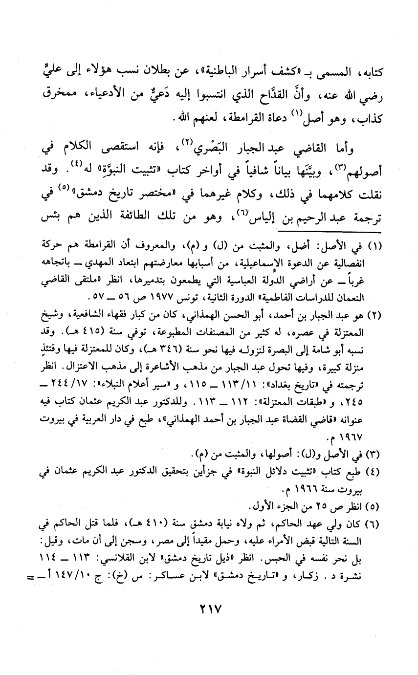 وَأما القَاضِي عبد الْجَبَّار الْبَصْرِيّ فَإِنَّهُ استقصى الْكَلَام فِي أصولهم وَبَينهَا بَيَانا شافيا فِي أَوَاخِر كتاب تثبيت النُّبُوَّة لَهُ وَقد نقلت كَلَامهمَا فِي ذَلِك وَكَلَام غَيرهمَا فِي مُخْتَصر تَارِيخ دمشق فِي تَرْجَمَة عبد الرَّحِيم بن إلْيَاس وَهُوَ من تِلْكَ الطَّائِفَة الَّذين هم بئس