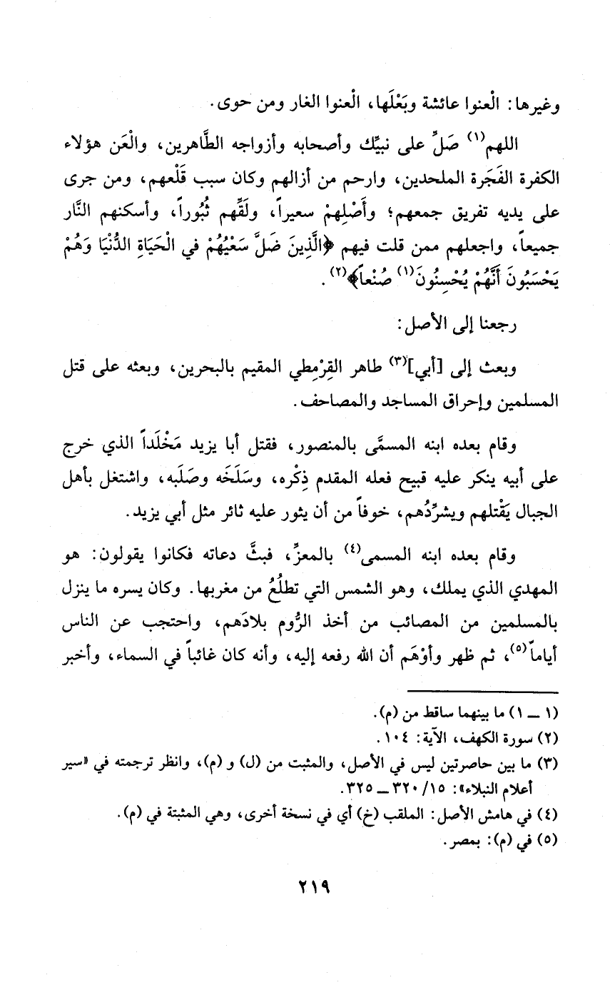 وَبعث إِلَى أبي طَاهِر القرمطي الْمُقِيم بِالْبَحْرَيْنِ وَبَعثه على قتل الْمُسلمين وإحراق الْمَسَاجِد والمصاحف