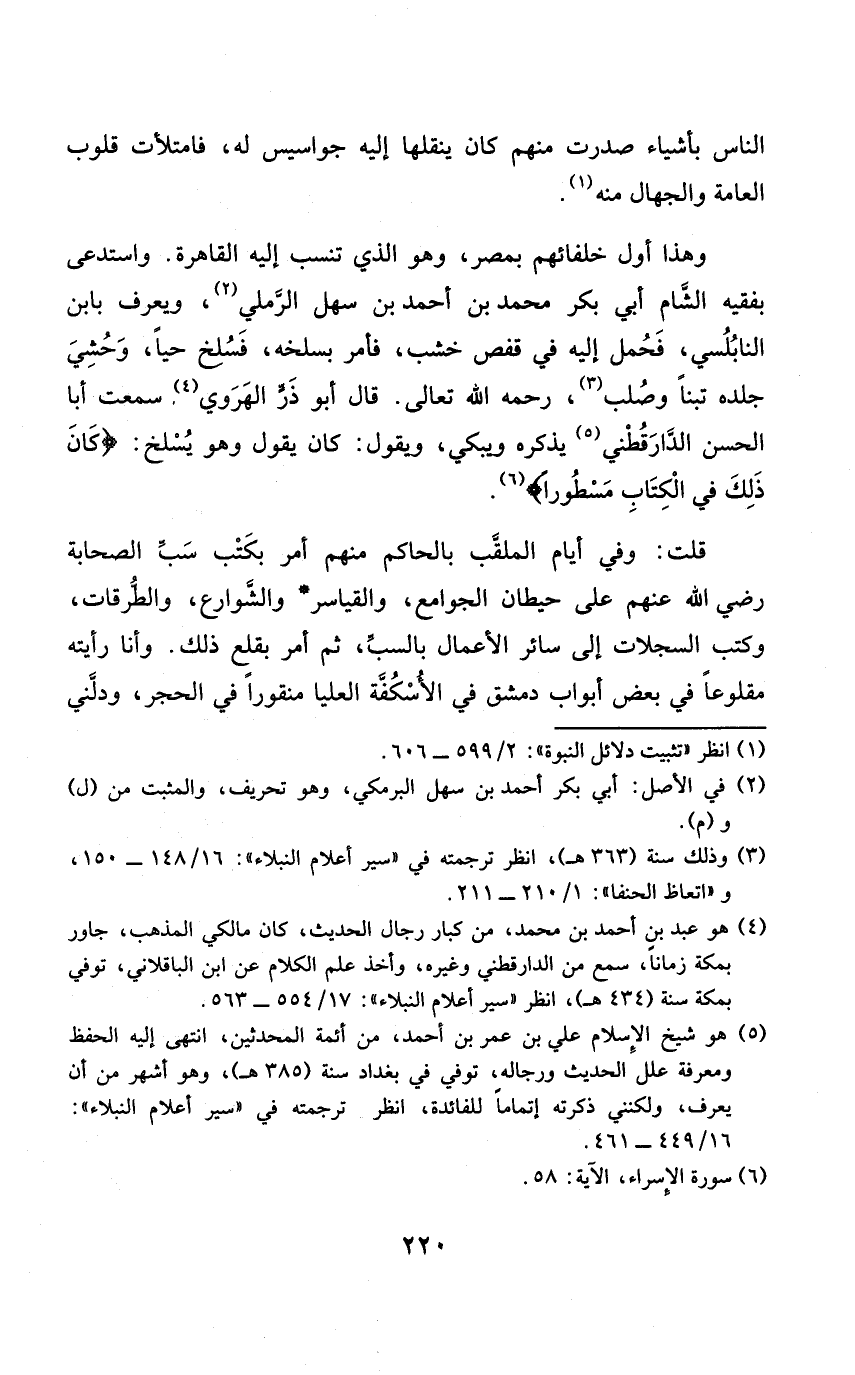 قلت وَفِي أَيَّام الملقب بالحاكم مِنْهُم أَمر بكتب سبّ الصَّحَابَة رَضِي الله عَنْهُم على حيطان الْجَوَامِع والقياسر والشوارع والطرقات وَكتب السجلات إِلَى سَائِر الْأَعْمَال بالسبّ ثمَّ أَمر بقلع ذَلِك وَأَنا رَأَيْته مقلوعاً فِي بعض أَبْوَاب دمشق فِي الأسكفة الْعليا منقوراً فِي الْحجر ودلّني