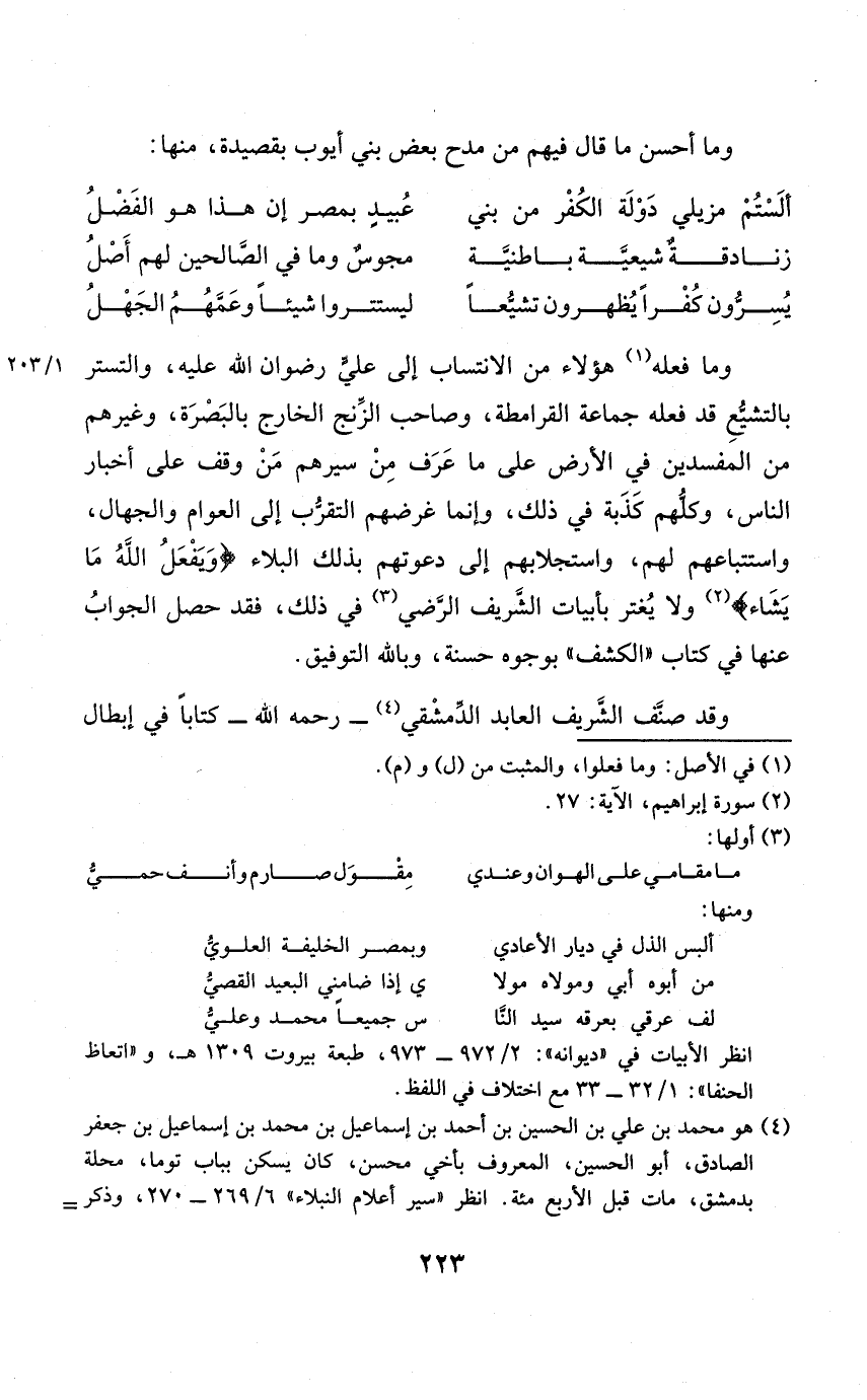 وَمَا فعله هَؤُلَاءِ من الانتساب إِلَى عليّ رضوَان الله عَلَيْهِ والتستر بالتشيع قد فعله جمَاعَة القرامطة وَصَاحب الزنج الْخَارِج بِالْبَصْرَةِ وَغَيرهم من المفسدين فِي الأَرْض على مَا عرف مِنْ سيرهم من وقف على أَخْبَار النَّاس وَكلهمْ كذبة فِي ذَلِك وَإِنَّمَا غرضهم التَّقَرُّب إِلَى الْعَوام والجهال واستتباعهم لَهُم واستجلابهم إِلَى دعوتهم بذلك الْبلَاء {وَيفْعل الله مَا يَشَاء} وَلَا يغتر بِأَبْيَات الشريف الرضي فِي ذَلِك فقد حصل الْجَواب عَنْهَا فِي كتاب الْكَشْف بِوُجُوه حَسَنَة وَبِاللَّهِ التَّوْفِيق