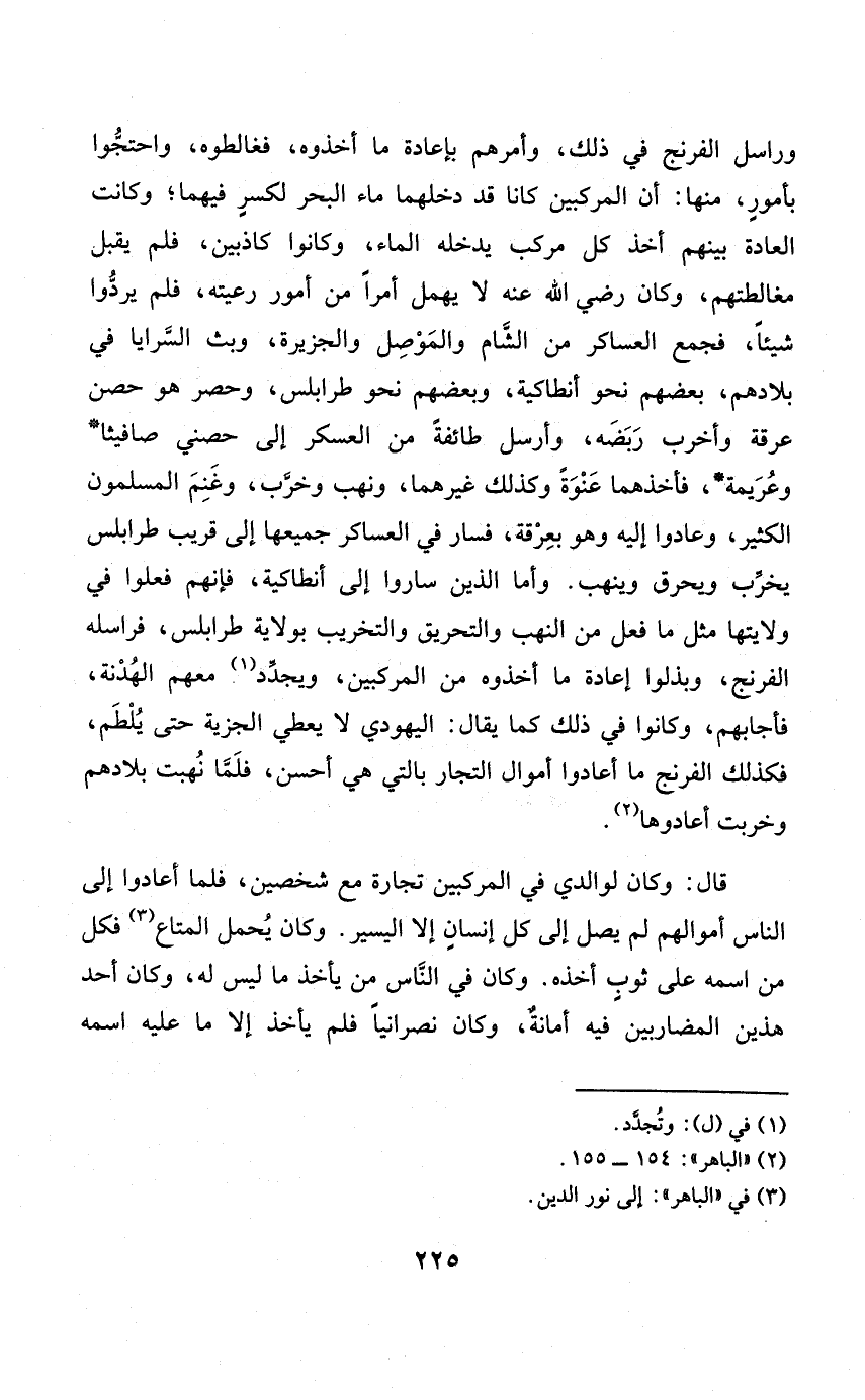 وراسل الفرنج فِي ذَلِك وَأمرهمْ بِإِعَادَة مَا أَخَذُوهُ فغالطوه وَاحْتَجُّوا بِأُمُور مِنْهَا أَن المركبين كَانَا قد دخلهما مَاء الْبَحْر لكسر فيهمَا وَكَانَت الْعَادة بَينهم أَخذ كل مركب يدْخلهُ المَاء وَكَانُوا كاذبين فَلم يقبل مغالطتهم وَكَانَ رَضِي الله عَنهُ لَا يهمل أمرا من أُمُور رَعيته فَلم يردوا شَيْئا فَجمع العساكر من الشَّام والموصل والجزيرة وَبث السَّرَايَا فِي بِلَادهمْ بَعضهم نَحْو أنطاكية وَبَعْضهمْ نَحْو طرابلس وَحصر هُوَ حصن عرقة وأخرب ربضه وَأرْسل طَائِفَة من الْعَسْكَر إِلَى حصني صافيثا وعريمة فَأَخذهُمَا عنْوَة وَكَذَلِكَ غَيرهمَا وَنهب وخرّب وغنم الْمُسلمُونَ الْكثير وعادوا إِلَيْهِ وَهُوَ بعرقة فَسَار فِي العساكر جَمِيعهَا إِلَى قريب طرابلس يخرب وَيحرق وينهب وَأما الَّذين سَارُوا إِلَى أنطاكية فَإِنَّهُم فعلوا فِي ولايتها مثل مَا فعل من النهب وَالتَّحْرِيق والتخريب بِولَايَة طرابلس فراسله الفرنج وبذلوا إِعَادَة مَا أَخَذُوهُ من المركبين ويجدد مَعَهم الْهُدْنَة فأجابهم وَكَانُوا فِي ذَلِك كَمَا يُقَال الْيَهُودِيّ لَا يُعْطي الْجِزْيَة حَتَّى يُلطم فَكَذَلِك الفرنج مَا أعادوا أَمْوَال التُّجَّار بِالَّتِي هِيَ أحسن فلمّا نُهبت بِلَادهمْ وَخَربَتْ أعادوها