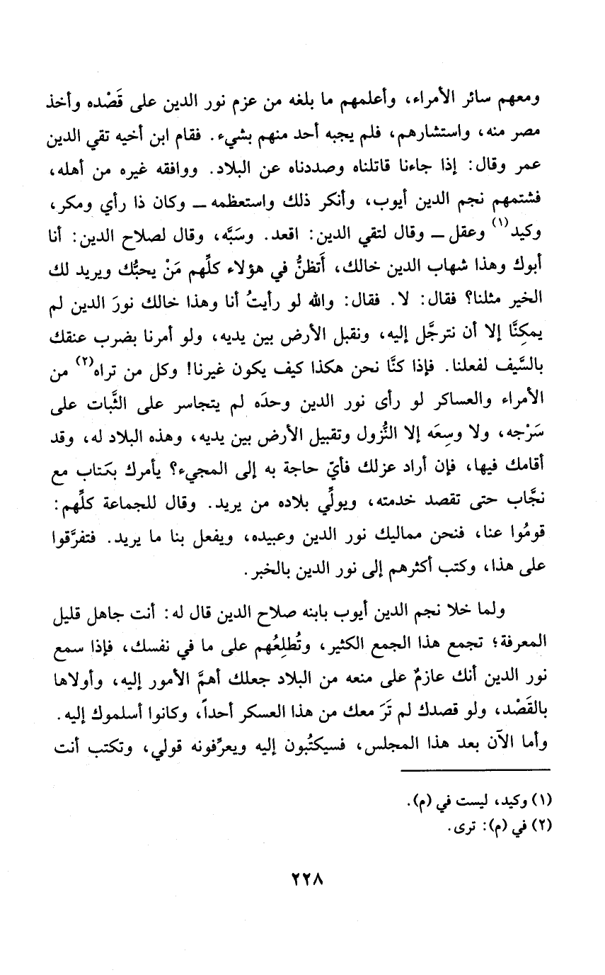 وَلما خلا نجم الدّين أَيُّوب بِابْنِهِ صَلَاح الدّين قَالَ لَهُ أَنْت جَاهِل قَلِيل الْمعرفَة تجمع هَذَا الْجمع الْكثير وتطلعهم على مَا فِي نَفسك فَإِذا سمع نور الدّين أَنَّك عازم على مَنعه من الْبِلَاد جعلك أهمّ الْأُمُور إِلَيْهِ وأولاها بِالْقَصْدِ وَلَو قصدك لم تَرَ مَعَك من هَذَا الْعَسْكَر أحدا وَكَانُوا أسلموك إِلَيْهِ وَأما الْآن بعد هَذَا الْمجْلس فسيكتبون إِلَيْهِ ويعرفونه قولي وتكتب أَنْت