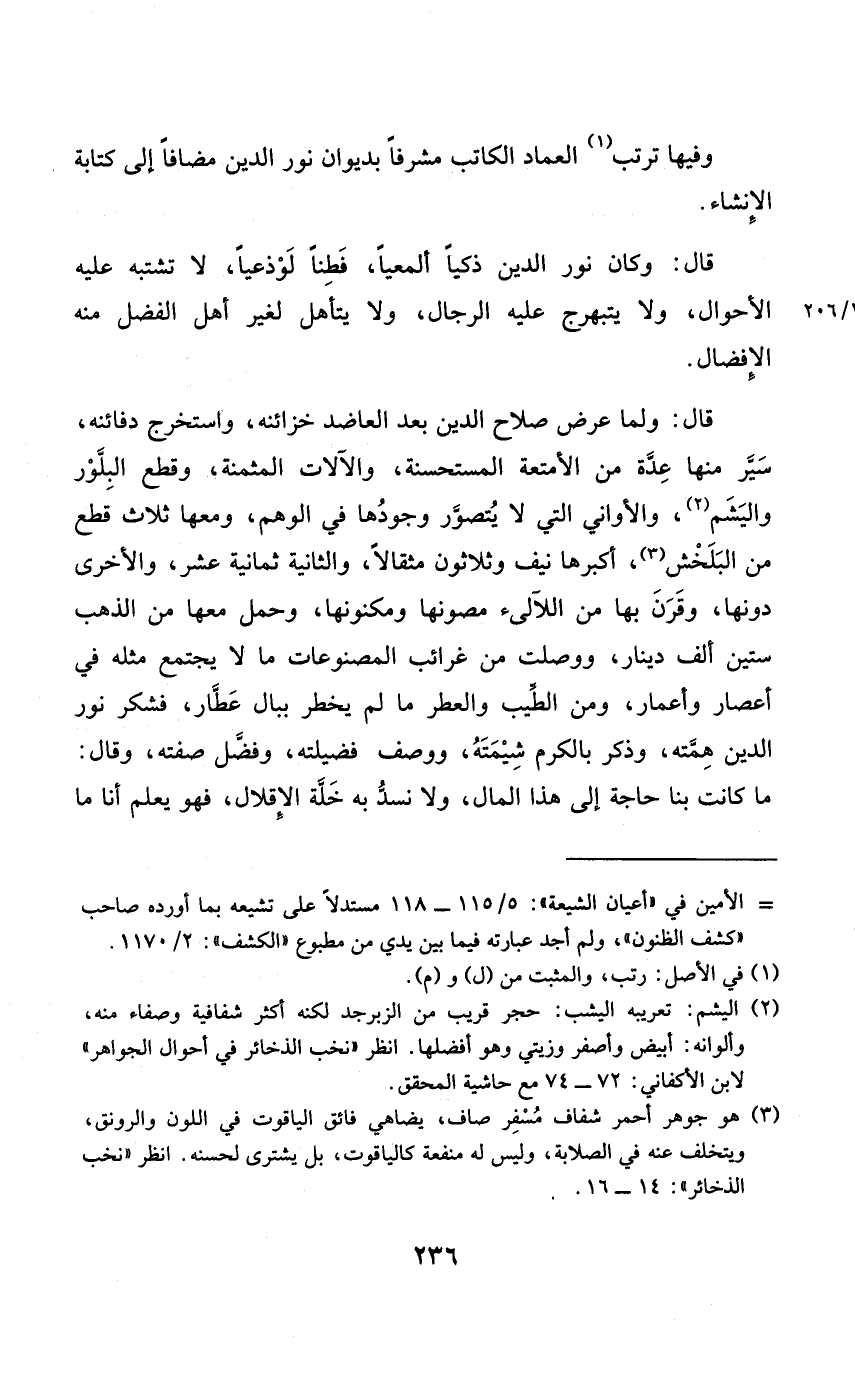 قَالَ وَلما عرض صَلَاح الدّين بعد العاضد خزائنه واستخرج دفائنه سير مِنْهَا عدَّة من الْأَمْتِعَة المستحسنة والآلات المثمنة وَقطع البلور واليشم والأواني الَّتِي لَا يتَصَوَّر وجودهَا فِي الْوَهم وَمَعَهَا ثَلَاث قطع من البلخش أكبرها نَيف وَثَلَاثُونَ مِثْقَالا وَالثَّانيَِة ثَمَانِيَة عشر وَالْأُخْرَى دونهَا وَقرن بهَا من اللآلئ مصونها ومكنونها وَحمل مَعهَا من الذَّهَب سِتِّينَ ألف دِينَار ووصلت من غرائب المصنوعات مَا لَا يجْتَمع مثله فِي أعصار وأعمار وَمن الطّيب والعطر مَا لم يخْطر ببال عطار فَشكر نور الدّين همته وَذكر بِالْكَرمِ شيمته وَوصف فضيلته وَفضل صفته وَقَالَ مَا كَانَت بِنَا حَاجَة إِلَى هَذَا المَال وَلَا نسد بِهِ خلة الإقلال فَهُوَ يعلم أَنا مَا