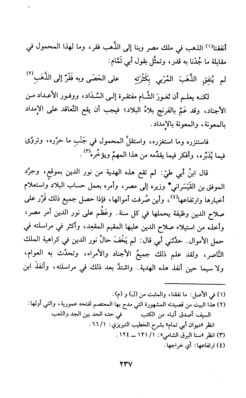 أنفقنا الذَّهَب فِي ملك مصر وبنا إِلَى الذَّهَب فقر وَمَا لهَذَا الْمَحْمُول فِي مُقَابلَة مَا جُدْنا بِهِ قدر وتمثل بقول أبي تَمام