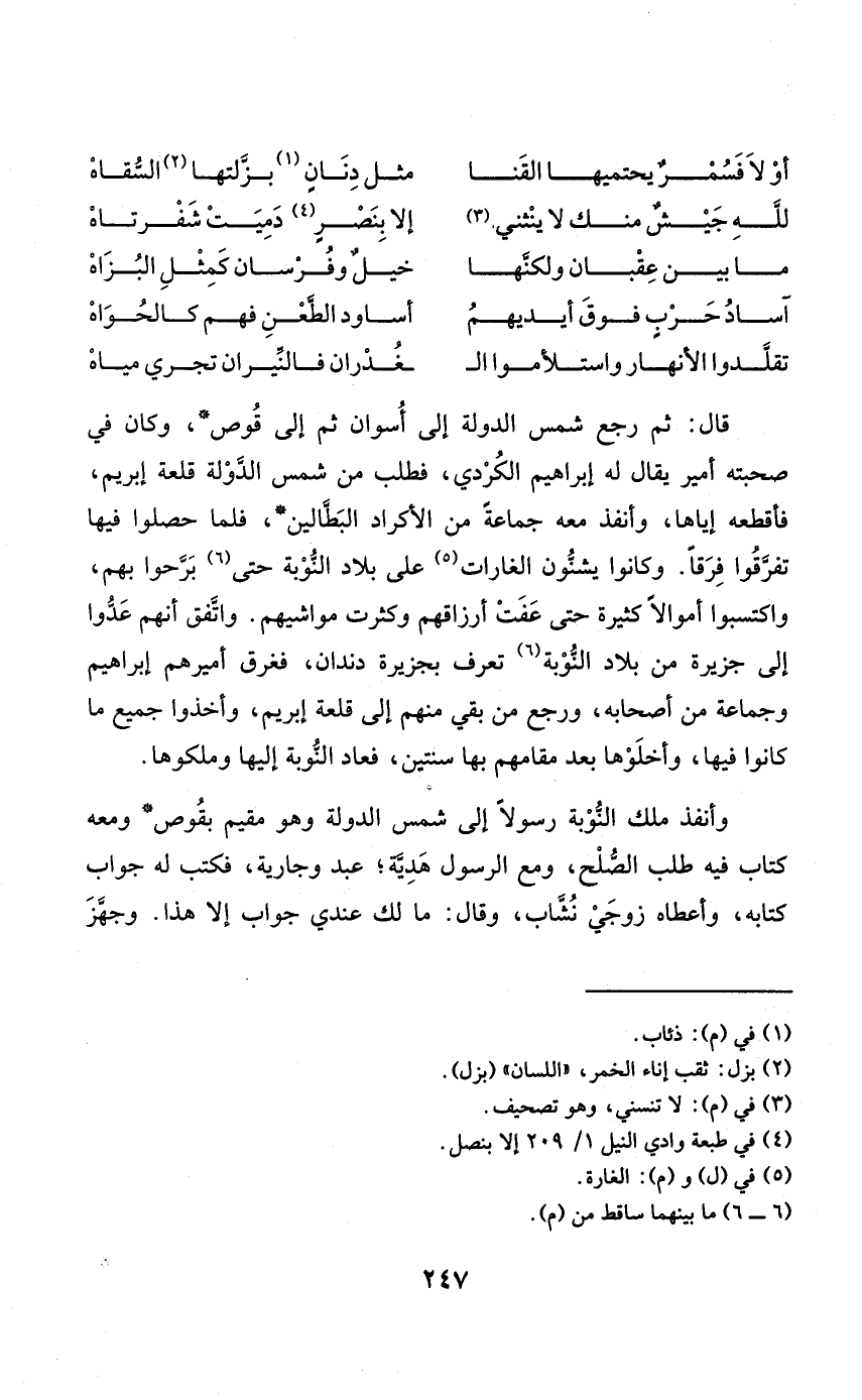 قَالَ ثمَّ رَجَعَ شمس الدولة إِلَى أسوان ثمَّ إِلَى قوص وَكَانَ فِي صحبته أَمِير يُقَال لَهُ إِبْرَاهِيم الْكرْدِي فَطلب من شمس الدولة قلعة إبريم فأقطعه إِيَّاهَا وأنفذ مَعَه جمَاعَة من الأكراد البطالين فَلَمَّا حصلوا فِيهَا تفرّقوا فرقا وَكَانُوا يشنون الغارات على بِلَاد النّوبة حَتَّى برحوا بهم واكتسبوا أَمْوَالًا كَثِيرَة حَتَّى عفت أَرْزَاقهم وَكَثُرت مَوَاشِيهمْ وأتفق أَنهم عدّوا إِلَى جَزِيرَة من بِلَاد النّوبَة تعرف بِجَزِيرَة دندان فغرق أَمِيرهمْ إِبْرَاهِيم وَجَمَاعَة من أَصْحَابه وَرجع من بَقِي مِنْهُم إِلَى قلعة إبريم وَأخذُوا جَمِيع مَا كَانُوا فِيهَا وأخلوها بعد مقامهم بهَا سنتَيْن فَعَاد النّوبَة إِلَيْهَا وملكوها