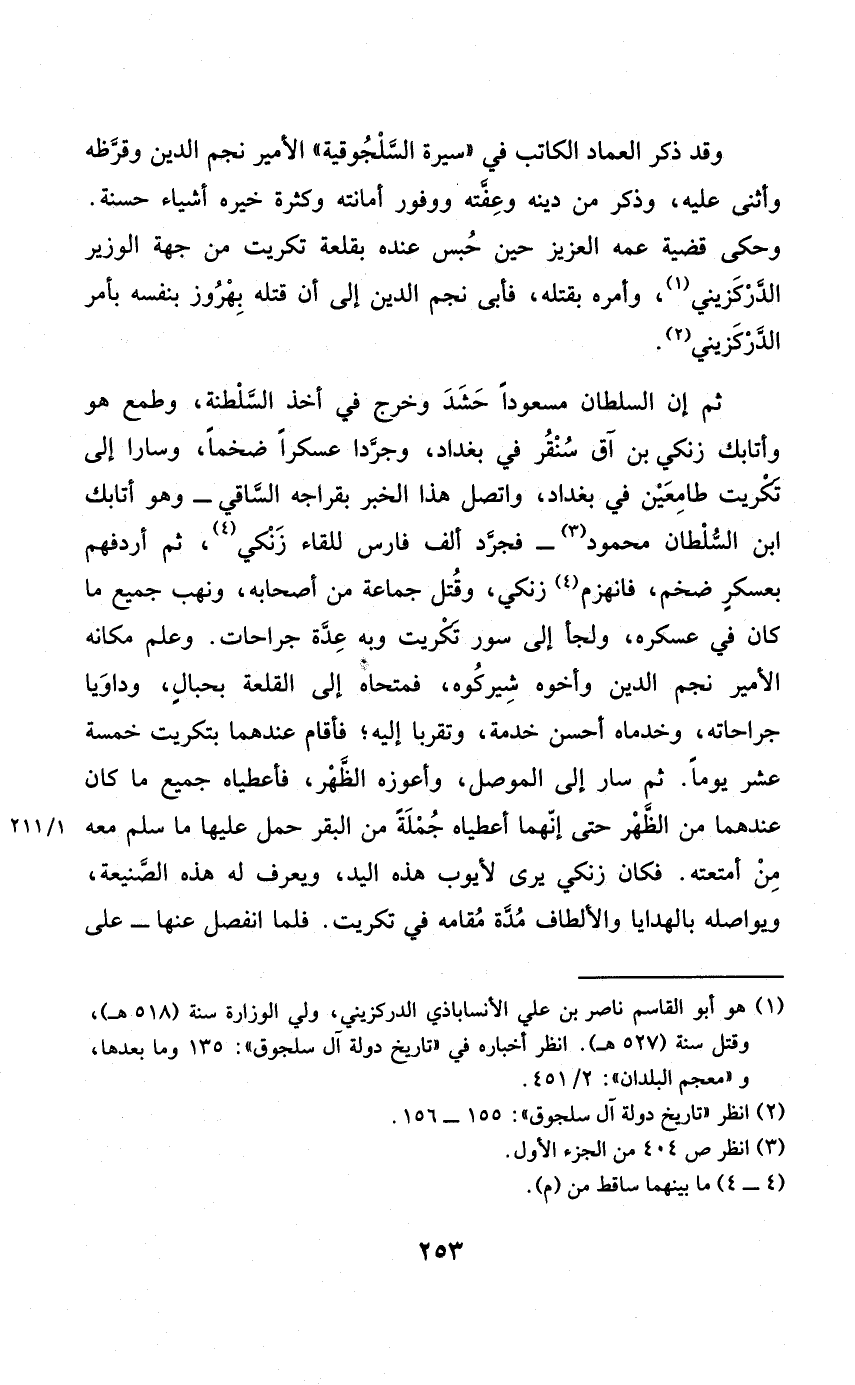 وَقد ذكر الْعِمَاد الْكَاتِب فِي سيرة السلجوقية الْأَمِير نجم الدّين وقرظة وَأثْنى عَلَيْهِ وَذكر من دينه وعفته ووفور أَمَانَته وَكَثْرَة خَيره أَشْيَاء حَسَنَة وَحكى قَضِيَّة عمّه الْعَزِيز حِين حبس عِنْده بقلعة تكريت من جِهَة الْوَزير الدركزيني وَأمره بقتْله فَأبى نجم الدّين إِلَى أَن قَتله بهروز بِنَفسِهِ بِأَمْر الدركزيني