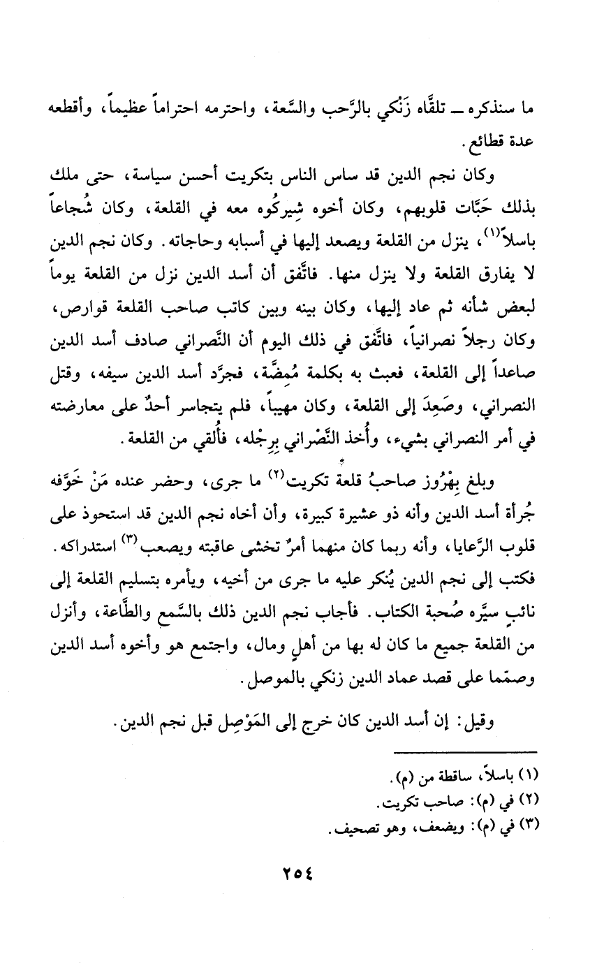 وَكَانَ نجم الدّين قد سَاس النَّاس بتكريت أحسن سياسة حَتَّى ملك بذلك حبّات قُلُوبهم وَكَانَ أَخُوهُ شيركوه مَعَه فِي القلعة وَكَانَ شجاعاً باسلا ينزل من القلعة ويصعد إِلَيْهَا فِي أَسبَابه وحاجاته وَكَانَ نجم الدّين لَا يُفَارق القلعة وَلَا ينزل مِنْهَا فاتفق أَن أَسد الدّين نزل من القلعة يَوْمًا لبَعض شَأْنه ثمَّ عَاد إِلَيْهَا وَكَانَ بَينه وَبَين كَاتب صَاحب القلعة قوارص وَكَانَ رجلا نَصْرَانِيّا فاتفق فِي ذَلِك الْيَوْم أَن النَّصْرَانِي صَادف أَسد الدّين صاعداً إِلَى القلعة فعبث بِهِ بِكَلِمَة مُمضة فَجرد أَسد الدّين سَيْفه وَقتل النَّصْرَانِي وَصعد إِلَى القلعة وَكَانَ مهيباً فَلم يتجاسر أحدُ على معارضته فِي أَمر النَّصْرَانِي بِشَيْء وأُخذ النَّصْرَانِي بِرجلِهِ فألُقي من القلعة