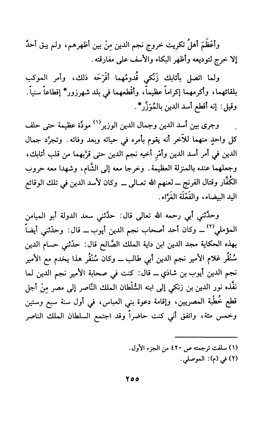 وحَدثني أبي رَحمَه الله تَعَالَى قَالَ حَدثنِي سعد الدولة أَبُو الميامن المؤملي وَكَانَ أحد أَصْحَاب نجم الدّين أَيُّوب قَالَ وحَدثني أَيْضا بِهَذِهِ الْحِكَايَة مجد الدّين ابْن داية الْملك الصَّالح قَالَ حَدثنِي حسام الدّين سنقر غُلَام الْأَمِير نجم الدّين أبي طَالب وَكَانَ سنقر هَذَا يخْدم مَعَ الْأَمِير نجم الدّين أَيُّوب بن شاذي قَالَ كنت فِي صحابة الْأَمِير نجم الدّين لما نفذه نور الدّين بن زنكي إِلَى ابْنه السُّلْطَان الْملك النَّاصِر إِلَى مصر من أجل قطع خطْبَة المصريين وَإِقَامَة دَعْوَة بني الْعَبَّاس فِي أول سنة سبع وَسِتِّينَ وَخمْس مئة وَاتفقَ أَنِّي كنت حَاضرا وَقد اجْتمع السُّلْطَان الْملك النَّاصِر