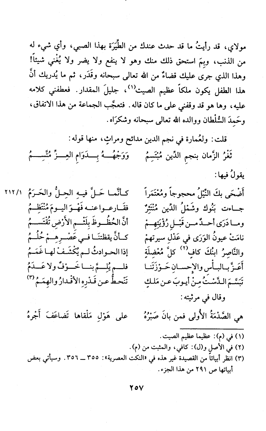 قلت ولعُمارة فِي نجم الدّين مدائح ومراثٍ مِنْهَا قَوْله
