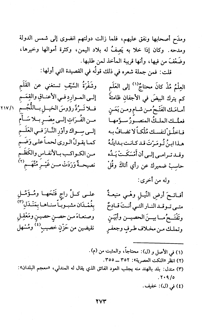 (الْعلم مذ كَانَ مُحْتَاج إِلَى الْعلم ... وشفرة السَّيْف تَسْتَغْنِي عَن الْقَلَم)